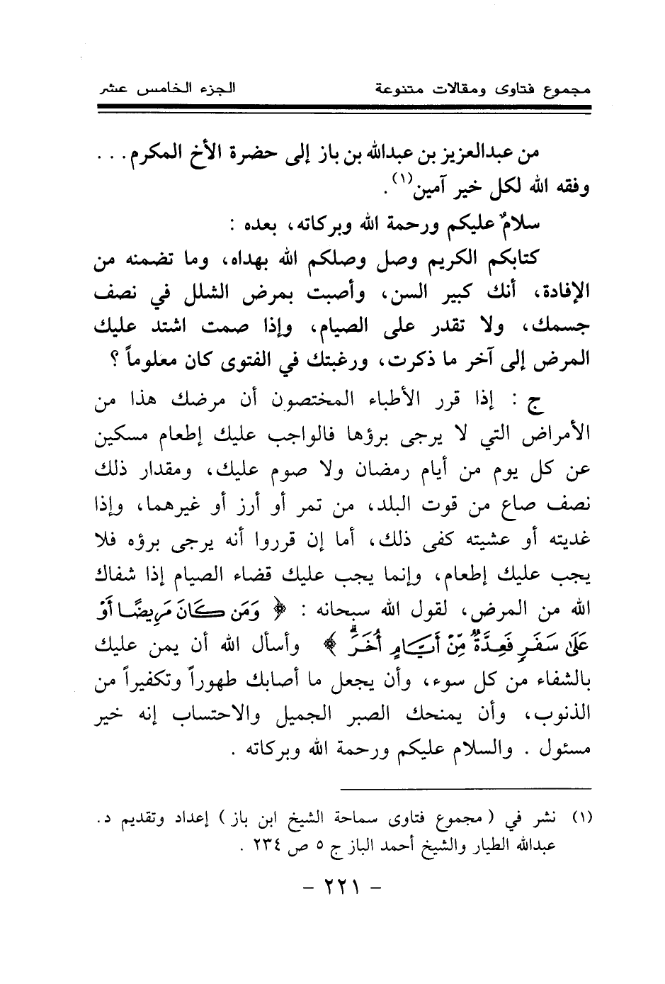 كتابكم الكريم وصلى وصلكم الله بهداه، وما تضمنه من الإفادة، أنك كبير السن، وأصبت بمرض الشلل في نصف جسمك، ولا تقدر على الصيام، وإذا صمت اشتد عليك المرض إلى آخر ما ذكرت، ورغبتك في الفتوى كان معلوما؟