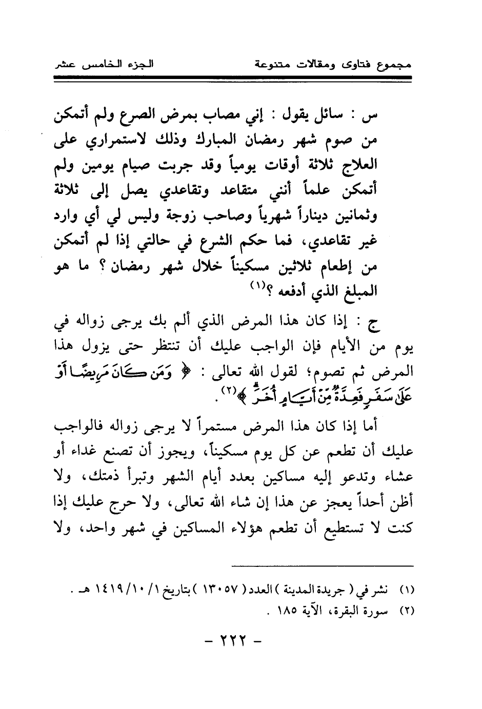 ج: إذا كان هذا المرض الذي ألم بك يرجى زواله في يوم من الأيام فإن الواجب عليك أن تنتظر حتى يزول هذا المرض ثم تصوم؛ لقول الله تعالى: {وَمَنْ كَانَ مَرِيضًا أَوْ عَلَى سَفَرٍ فَعِدَّةٌ مِنْ أَيَّامٍ أُخَرَ} (¬2)