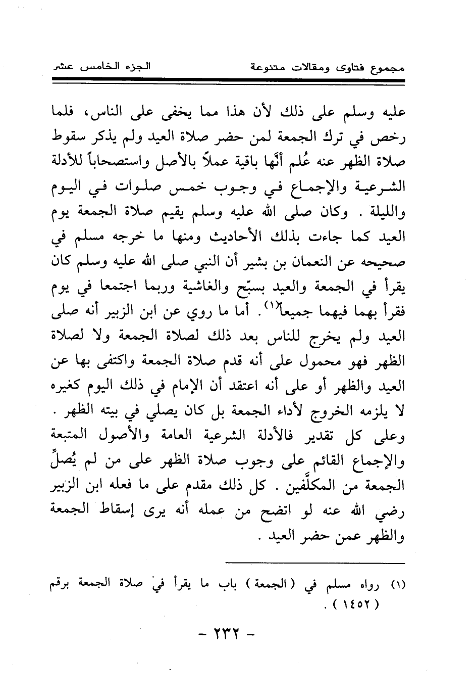 وعلى كل تقدير فالأدلة الشرعية العامة والأصول المتبعة والإجماع القائم على وجوب صلاة الظهر على من لم يصل الجمعة من المكلفين. كل ذلك مقدم على ما فعله ابن الزبير رضي الله عنه لو اتضح من عمله أنه يرى إسقاط الجمعة والظهر عمن حضر العيد.