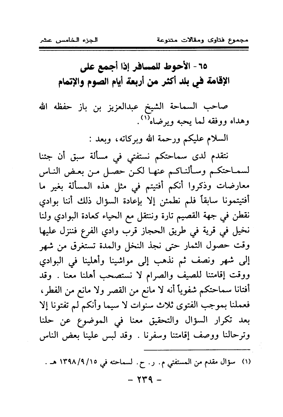 نتقدم لدى سماحتكم نستفتي في مسألة سبق أن جئنا لسماحتكم وسألناكم عنها لكن حصل من بعض الناس معارضات وذكروا أنكم أفتيتم في مثل هذه المسألة بغير ما أفتيتمونا سابقا، فلم نطمئن إلا بإعادة السؤال ذلك أننا بوادي نقطن في جهة القصيم تارة وننتقل مع الحياء كعادة البوادي، ولنا نخيل في قرية في طريق الحجاز قرب وادي الفرع، فننزل عليها وقت حصول الثمار حتى نجذ النخل، والمدة تستغرق من شهر إلى شهر ونصف، ثم نذهب إلى مواشينا وأهلينا في البوادي ووقت إقامتنا للصيف والصرام لا نستصحب أهلنا معنا. وقد أفتانا سماحتكم شفويا أنه لا مانع من القصر ولا مانع من الفطر، فعملنا بموجب الفتوى ثلاث سنوات لا سيما وأنكم لم تفتونا إلا بعد تكرار السؤال والتحقيق معنا في الموضوع عن حلنا وترحالنا ووصف إقامتنا وسفرنا. وقد لبس علينا بعض الناس