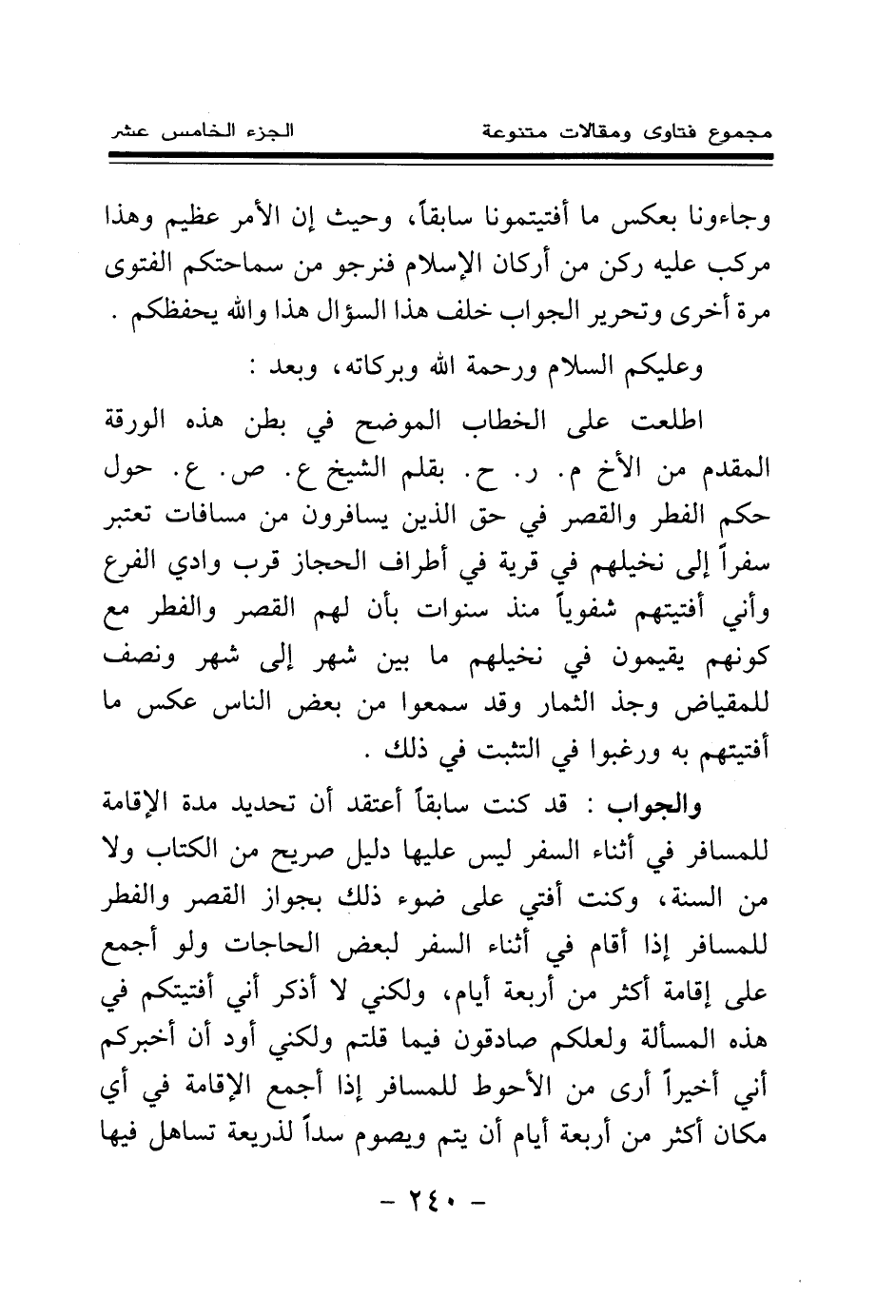 اطلعت على الخطاب الموضح في بطن هذه الورقة المقدم من الأخ م. ر. ح. بقلم الشيخ ع. ص. ع. حول حكم الفطر والقصر في حق الذين يسافرون من مسافات تعتبر سفرا إلى نخيلهم في قرية في أطراف الحجاز قرب وادي الفرع، وأني أفتيتهم شفويا منذ سنوات بأن لهم القصر والفطر مع كونهم يقيمون في نخيلهم ما بين شهر إلى شهر ونصف؛ للمقياض وجذ الثمار، وقد سمعوا من بعض الناس عكس ما أفتيتهم به ورغبوا في التثبت في ذلك.