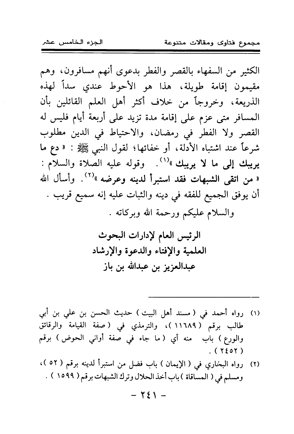 الكثير من السفهاء بالقصر والفطر بدعوى أنهم مسافرون، وهم مقيمون إقامة طويلة، هذا هو الأحوط عندي سدا لهذه الذريعة، وخروجا من خلاف أكثر أهل العلم القائلين بأن المسافر متى عزم على إقامة مدة تزيد على أربعة أيام فليس له القصر ولا الفطر في رمضان، والاحتياط في الدين مطلوب شرعا عند اشتباه الأدلة، أو خفائها؛ لقول النبي صلى الله عليه وسلم: «دع ما يريبك إلى ما لا يريبك (¬1) » . وقوله عليه الصلاة والسلام: «من اتقى الشبهات فقد استبرأ لدينه وعرضه (¬2) » . وأسأل الله أن يوفق الجميع للفقه في دينه والثبات عليه إنه سميع قريب. والسلام عليكم ورحمة الله وبركاته.
