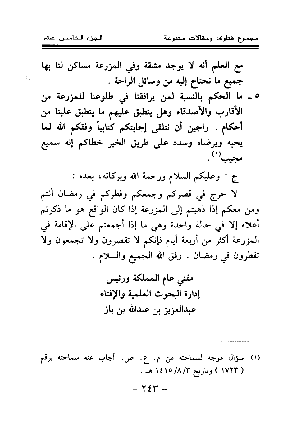 5 - ما الحكم بالنسبة لمن يرافقنا في طلوعنا للمزرعة من الأقارب والأصدقاء؟ وهل ينطبق عليهم ما ينطبق علينا من أحكام. راجين أن نتلقى إجابتكم كتابيا وفقكم الله لما يحبه ويرضاه، وسدد على طريق الخير خطاكم إنه سميع مجيب (¬1) .