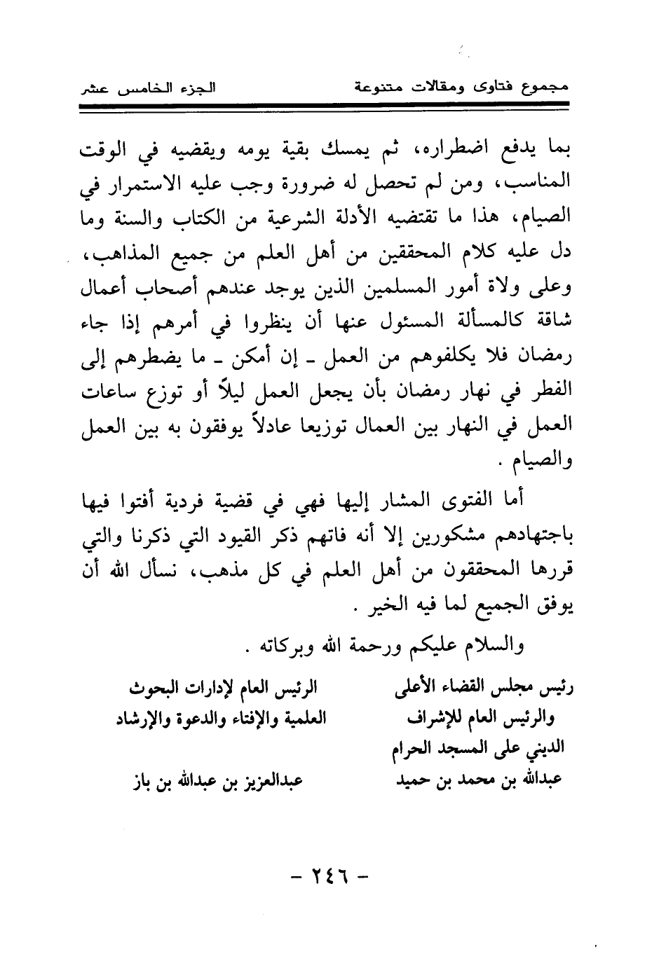 بما يدفع اضطراره، ثم يمسك بقية يومه ويقضيه في الوقت المناسب، ومن لم تحصل له ضرورة وجب عليه الاستمرار في الصيام، هذا ما تقتضيه الأدلة الشرعية من الكتاب والسنة، وما دل عليه كلام المحققين من أهل العلم من جميع المذاهب، وعلى ولاة أمور المسلمين الذين يوجد عندهم أصحاب أعمال شاقة كالمسألة المسئول عنها أن ينظروا في أمرهم إذا جاء رمضان فلا يكلفوهم من العمل- إن أمكن- ما يضطرهم إلى الفطر في نهار رمضان بأن يجعل العمل ليلا أو توزع ساعات العمل في النهار بين العمال توزيعا عادلا يوفقون به بين العمل والصيام.
