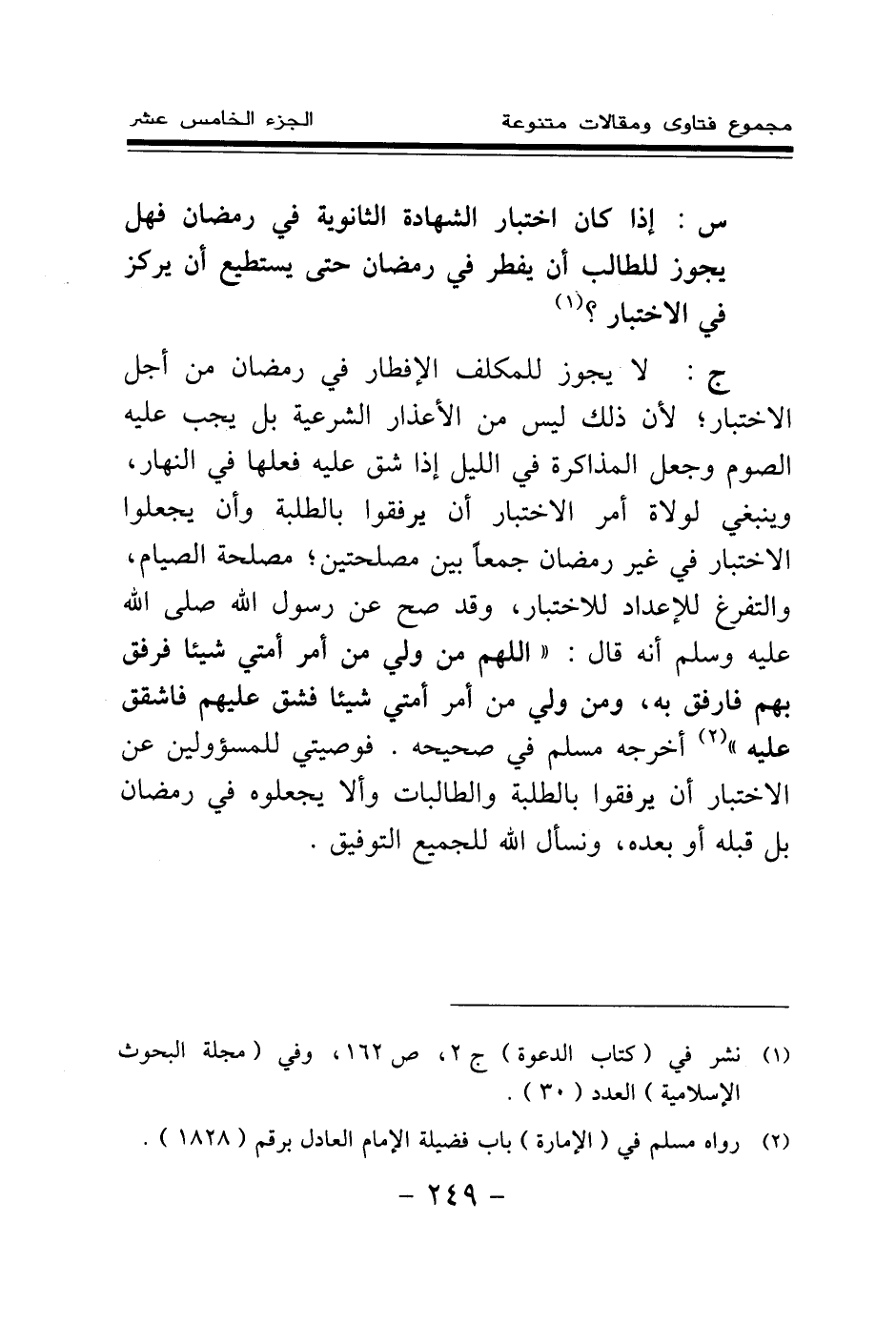 ج: لا يجوز للمكلف الإفطار في رمضان من أجل الاختبار؛ لأن ذلك ليس من الأعذار الشرعية، بل يجب عليه الصوم وجعل المذاكرة في الليل إذا شق عليه فعلها في النهار، وينبغي لولاة أمر الاختبار أن يرفقوا بالطلبة، وأن يجعلوا الاختبار في غير رمضان جمعا بين مصلحتين؛ مصلحة الصيام، والتفرغ للإعداد للاختبار، وقد صح عن رسول الله صلى الله عليه وسلم أنه قال: «اللهم من ولي من أمر أمتي شيئا فرفق بهم فارفق به، ومن ولي من أمر أمتي شيئا فشق عليهم فاشقق عليه (¬2) » أخرجه مسلم في صحيحه. فوصيتي للمسئولين عن الاختبار أن يرفقوا بالطلبة والطالبات، وألا يجعلوه في رمضان بل قبله أو بعده، ونسأل الله للجميع التوفيق.