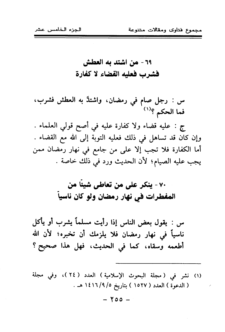 70 - ينكر على من تعاطى شيئا من المفطرات في نهار رمضان ولو كان ناسيا