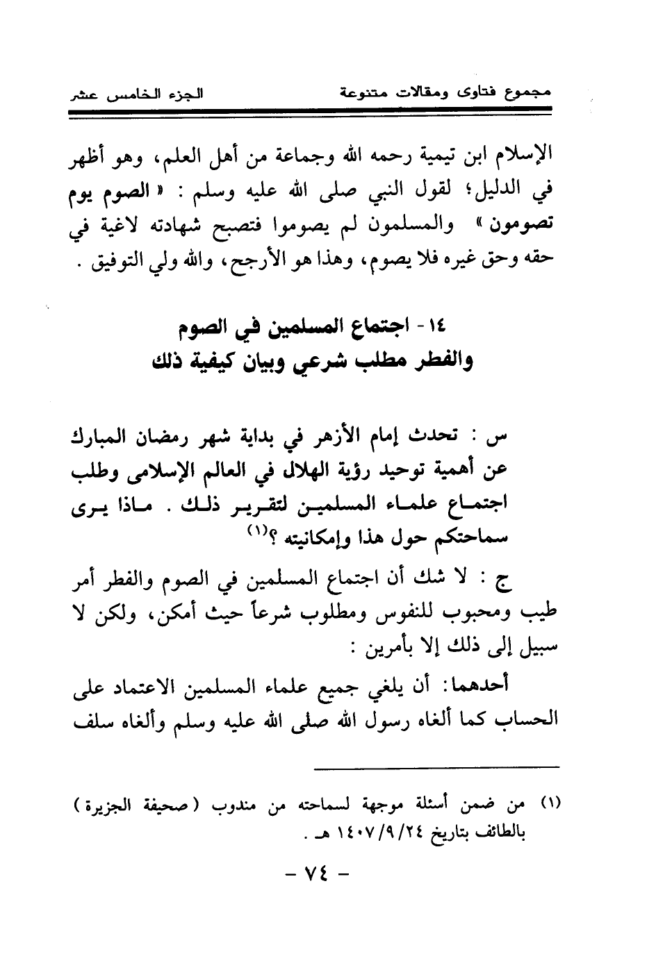 س: تحدث إمام الأزهر في بداية شهر رمضان المبارك عن أهمية توحيد رؤية الهلال في العالم الإسلامي وطلب اجتماع علماء المسلمين لتقرير ذلك. ماذا يرى سماحتكم حول هذا وإمكانيته؟ (¬1)