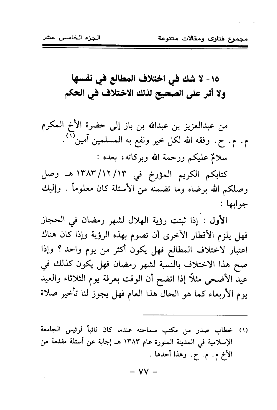 15 - لا شك في اختلاف المطالع في نفسها ولا أثر على الصحيح لذلك الاختلاف في الحكم