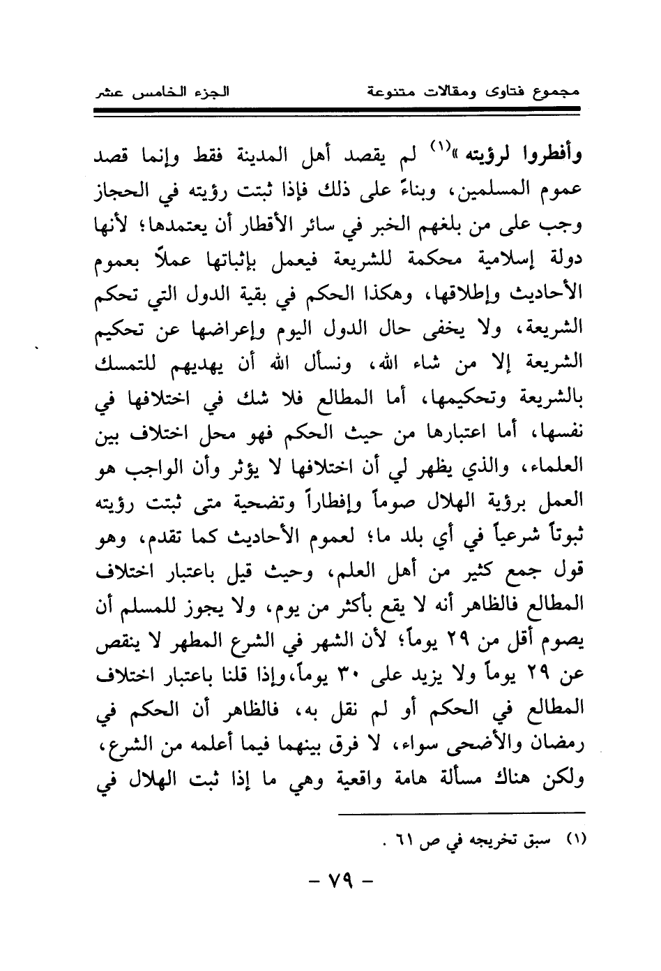 وأفطروا لرؤيته (¬1) » لم يقصد أهل المدينة فقط، وإنما قصد عموم المسلمين، وبناء على ذلك فإذا ثبتت رؤيته في الحجاز وجب على من بلغهم الخبر في سائر الأقطار أن يعتمدها؛ لأنها دولة إسلامية محكمة للشريعة فيعمل بإثباتها عملا بعموم الأحاديث وإطلاقها، وهكذا الحكم في بقية الدول التي تحكم الشريعة، ولا يخفى حال الدول اليوم وإعراضها عن تحكيم الشريعة إلا من شاء الله، ونسأل الله أن يهديهم للتمسك بالشريعة وتحكيمها، أما المطالع فلا شك في اختلافها في نفسها، أما اعتبارها من حيث الحكم فهو محل اختلاف بين العلماء، والذي يظهر لي أن اختلافها لا يؤثر وأن الواجب هو العمل برؤية الهلال صوما وإفطارا وتضحية متى ثبتت رؤيته ثبوتا شرعيا في أي بلد ما؛ لعموم الأحاديث كما تقدم، وهو قول جمع كثير من أهل العلم.