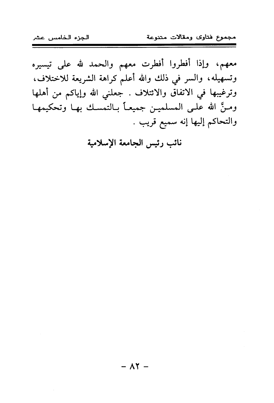 معهم، وإذا أفطروا أفطرت معهم، والحمد لله على تيسيره وتسهيله، والسر في ذلك والله أعلم كراهة الشريعة للاختلاف، وترغيبها في الاتفاق والائتلاف. جعلني الله وإياكم من أهلها، ومن الله على المسلمين جميعا بالتمسك بها وتحكيمها والتحاكم إليها، إنه سميع قريب.