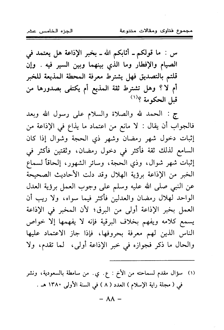 ج: الحمد لله والصلاة والسلام على رسول الله، وبعد، فالجواب أن يقال: لا مانع من اعتماد ما يذاع في الإذاعة من إثبات دخول شهر رمضان وشهر ذي الحجة وشوال إذا كان السامع لذلك ثقة فأكثر في دخول رمضان، وثقتين فأكثر في إثبات شهر شوال، وذي الحجة، وسائر الشهور، إلحاقا لسماع الخبر من الإذاعة برؤية الهلال، وقد دلت الأحاديث الصحيحة عن النبي صلى الله عليه وسلم على وجوب العمل برؤية العدل الواحد لهلال رمضان والعدلين فأكثر فيما سواه، ولا ريب أن العمل بخبر الإذاعة أولى من البرق؛ لأن المخبر في الإذاعة يسمع كلامه ويفهم بخلاف البرقية فإنه لا يفهمها إلا خواص الناس الذين لهم معرفة بحروفها، فإذا جاز الاعتماد عليها والحال ما ذكر فجوازه في خبر الإذاعة أولى، لما تقدم، ولا