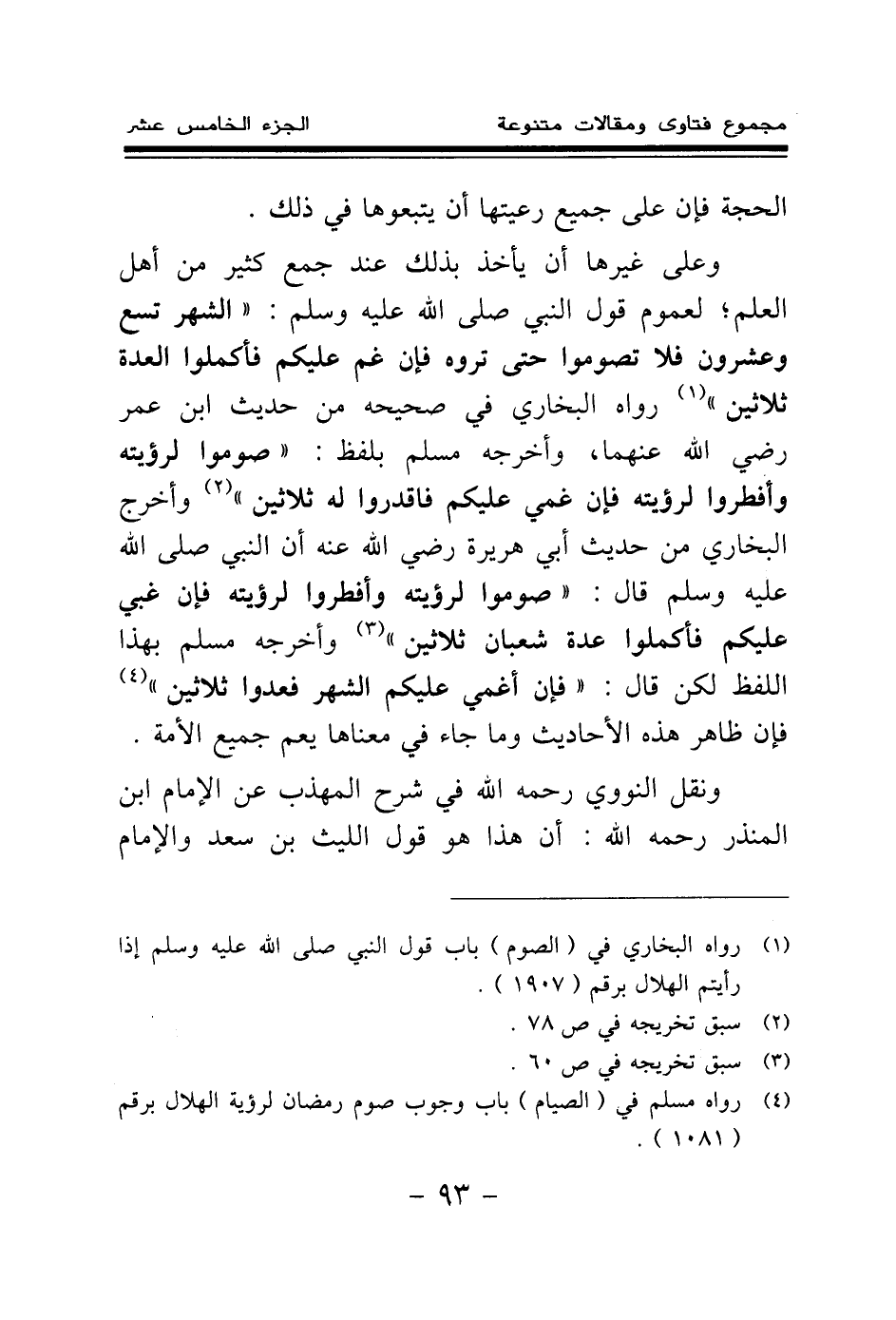 وعلى غيرها أن يأخذ بذلك عند جمع كثير من أهل العلم؛ لعموم قول النبي صلى الله عليه وسلم: «الشهر تسع وعشرون، فلا تصوموا حتى تروه، فإن غم عليكم فأكملوا العدة ثلاثين (¬1) » . رواه البخاري في صحيحه من حديث ابن عمر رضي الله عنهما، وأخرجه مسلم بلفظ: «صوموا لرؤيته وأفطروا لرؤيته، فإن غمي عليكم فاقدروا له ثلاثين (¬2) » . وأخرج البخاري من حديث أبي هريرة رضي الله عنه، أن النبي صلى الله عليه وسلم قال: «صوموا لرؤيته وأفطروا لرؤيته، فإن غبي عليكم فأكملوا عدة شعبان ثلاثين (¬3) » . وأخرجه مسلم بهذا اللفظ لكن قال: «فإن أغمي عليكم الشهر فعدوا ثلاثين (¬4) » . فإن ظاهر هذه الأحاديث وما جاء في معناها يعم جميع الأمة.