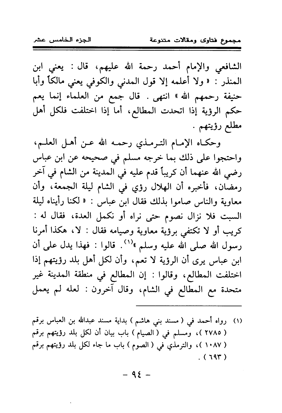 (¬1) رواه أحمد في (مسند بني هاشم) بداية مسند عبد الله بن العباس برقم (2785) ، ومسلم في (الصيام) باب بيان أن لكل بلد رؤيتهم برقم (1087) ، والترمذي في (الصوم) باب ما جاء لكل بلد رؤيتهم برقم (693) .