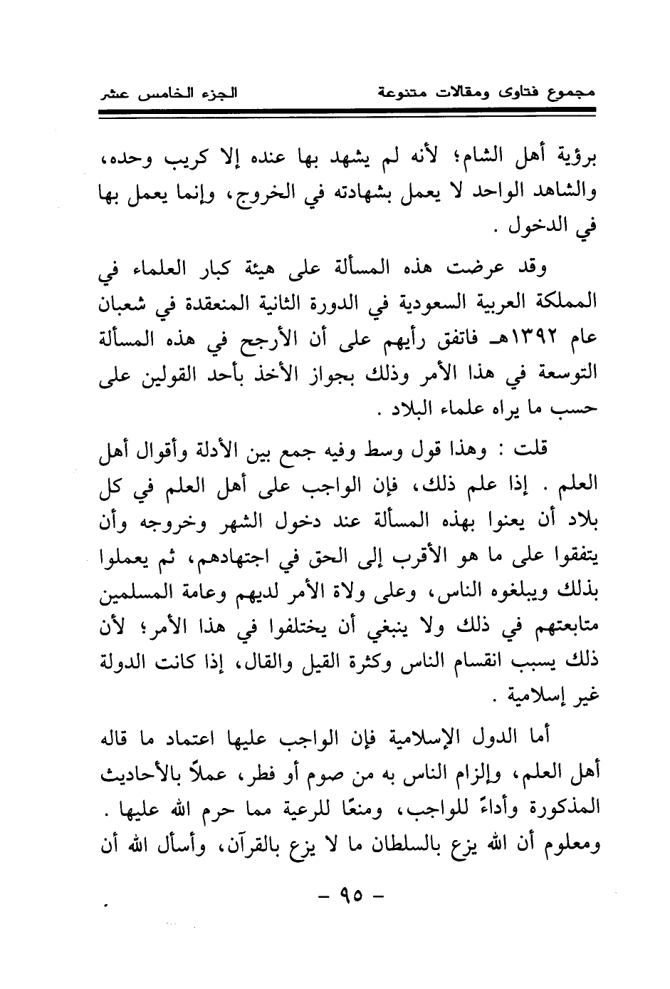 قلت: وهذا قول وسط، وفيه جمع بين الأدلة وأقوال أهل العلم. إذا علم ذلك، فإن الواجب على أهل العلم في كل بلاد أن يعنوا بهذه المسألة عند دخول الشهر وخروجه، وأن يتفقوا على ما هو الأقرب إلى الحق في اجتهادهم، ثم يعملوا بذلك ويبلغوه الناس، وعلى ولاة الأمر لديهم وعامة المسلمين متابعتهم في ذلك، ولا ينبغي أن يختلفوا في هذا الأمر؛ لأن ذلك يسبب انقسام الناس وكثرة القيل والقال، إذا كانت الدولة غير إسلامية.