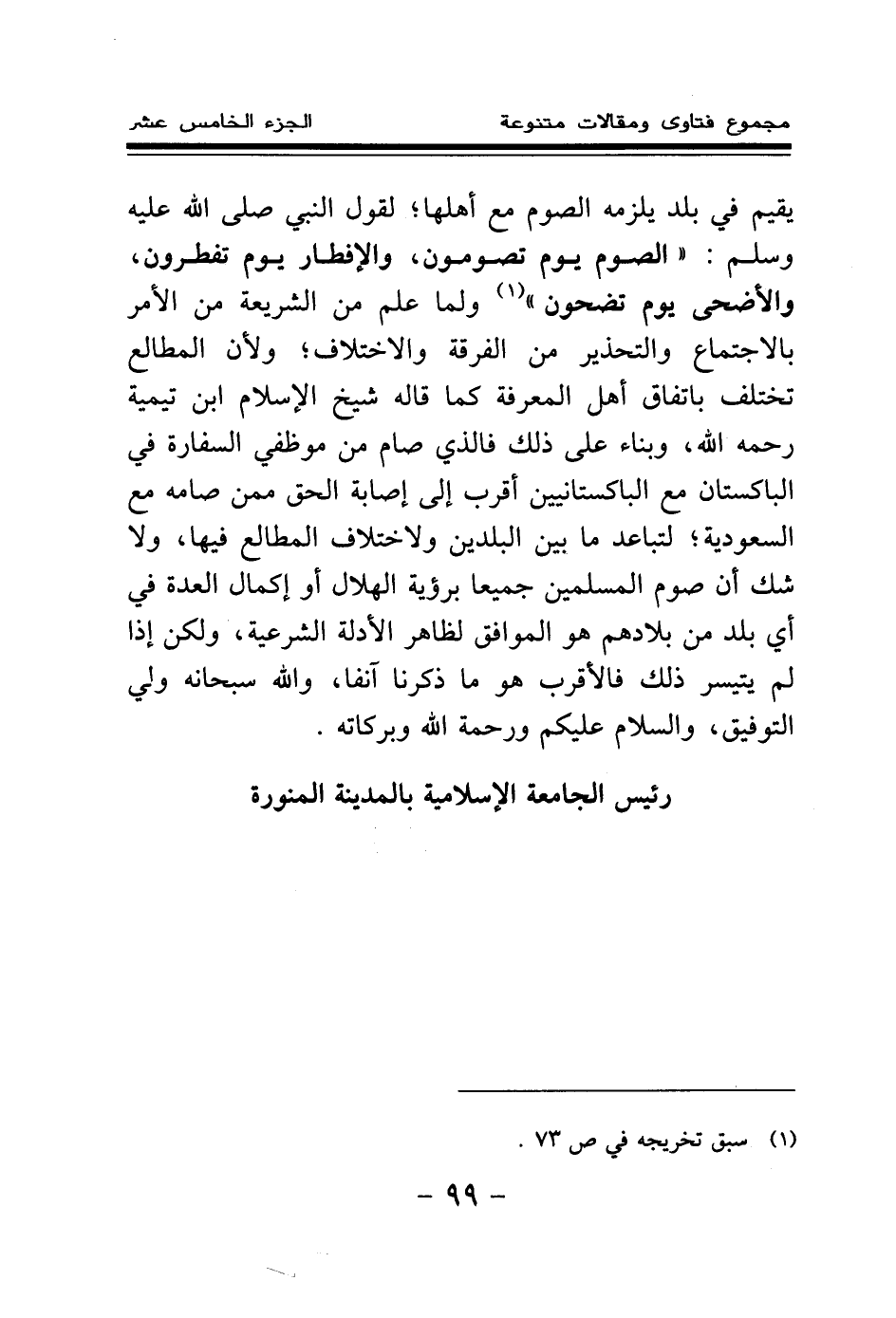 يقيم في بلد يلزمه الصوم مع أهلها؛ لقول النبي صلى الله عليه وسلم: «الصوم يوم تصومون، والإفطار يوم تفطرون، والأضحى يوم تضحون (¬1) » ، ولما علم من الشريعة من الأمر بالاجتماع والتحذير من الفرقة والاختلاف، ولأن المطالع تختلف باتفاق أهل المعرفة كما قاله شيخ الإسلام ابن تيمية رحمه الله، وبناء على ذلك فالذي صام من موظفي السفارة في الباكستان مع الباكستانيين أقرب إلى إصابة الحق ممن صامه مع السعودية؛ لتباعد ما بين البلدين ولاختلاف المطالع فيها، ولا شك أن صوم المسلمين جميعا برؤية الهلال أو إكمال العدة في أي بلد من بلادهم هو الموافق لظاهر الأدلة الشرعية، ولكن إذا لم يتيسر ذلك فالأقرب هو ما ذكرنا آنفا، والله سبحانه ولي التوفيق، والسلام عليكم ورحمة الله وبركاته.