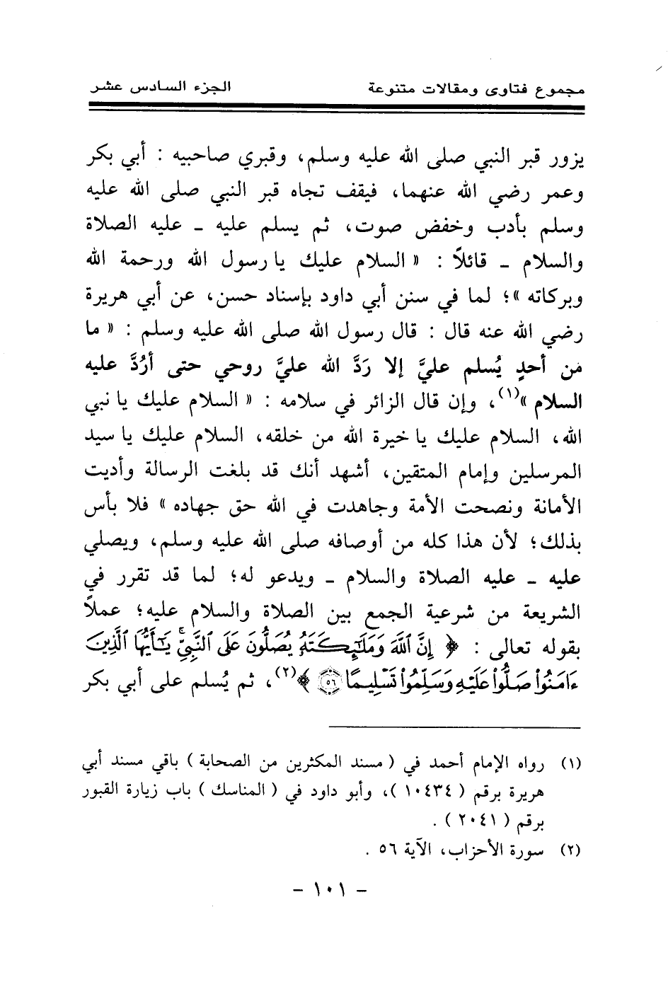 يزور قبر النبي صلى الله عليه وسلم، وقبري صاحبيه: أبي بكر وعمر رضي الله عنهما، فيقف تجاه قبر النبي صلى الله عليه وسلم بأدب وخفض صوت، ثم يسلم عليه - عليه الصلاة والسلام - قائلا: " السلام عليك يا رسول الله ورحمة الله وبركاته "؛ لما في سنن أبي داود بإسناد حسن، عن أبي هريرة رضي الله عنه قال: قال رسول الله صلى الله عليه وسلم: «ما من أحد يسلم علي إلا رد الله علي روحي حتى أرد عليه السلام (¬1) » ، وإن قال الزائر في سلامه: " السلام عليك يا نبي الله، السلام عليك يا خيرة الله من خلقه، السلام عليك يا سيد المرسلين وإمام المتقين، أشهد أنك قد بلغت الرسالة وأديت الأمانة ونصحت الأمة وجاهدت في الله حق جهاده " فلا بأس بذلك؛ لأن هذا كله من أوصافه صلى الله عليه وسلم، ويصلي عليه - عليه الصلاة والسلام - ويدعو له؛ لما قد تقرر في الشريعة من شرعية الجمع بين الصلاة والسلام عليه؛ عملا بقوله تعالى: {إِنَّ اللَّهَ وَمَلَائِكَتَهُ يُصَلُّونَ عَلَى النَّبِيِّ يَا أَيُّهَا الَّذِينَ آمَنُوا صَلُّوا عَلَيْهِ وَسَلِّمُوا تَسْلِيمًا} (¬2) ثم يسلم على أبي بكر