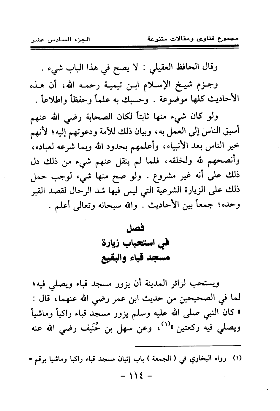 (¬1) رواه البخاري في (الجمعة) باب إتيان مسجد قباء راكبا وماشيا برقم (1194) ، ومسلم في (الحج) باب فضل مسجد قباء برقم (1399) .