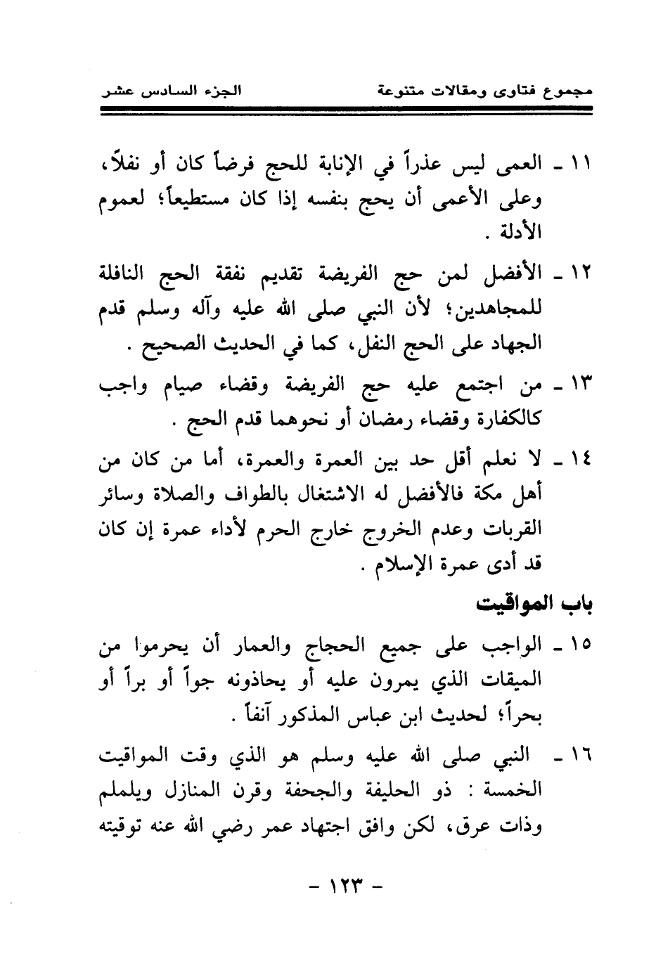 15 - الواجب على جميع الحجاج والعمار أن يحرموا من الميقات الذي يمرون عليه أو يحاذونه جوا أو برا أو بحرا؛ لحديث ابن عباس المذكور آنفا.
