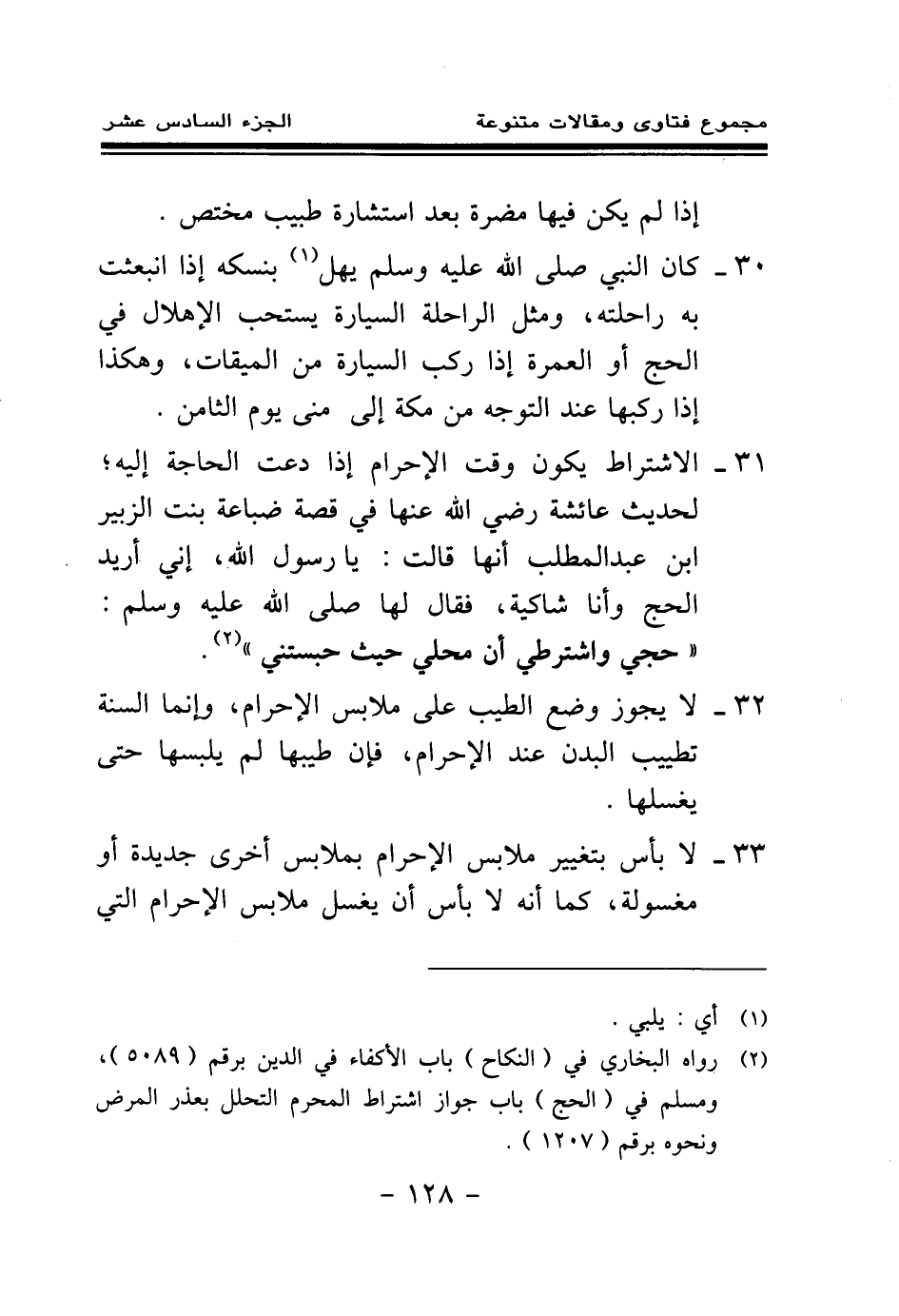 31 - الاشتراط يكون وقت الإحرام إذا دعت الحاجة إليه؛ لحديث عائشة رضي الله عنها في قصة ضباعة بنت الزبير بن عبد المطلب أنها قالت: «يا رسول الله، إني أريد الحج وأنا شاكية، فقال لها صلى الله عليه وسلم: حجي واشترطي أن محلي حيث حبستني (¬2) » .