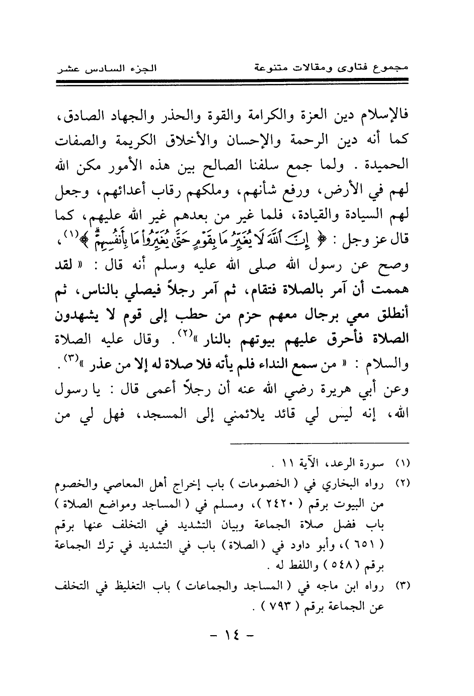 فالإسلام دين العزة والكرامة والقوة والحذر والجهاد الصادق، كما أنه دين الرحمة والإحسان والأخلاق الكريمة والصفات الحميدة. ولما جمع سلفنا الصالح بين هذه الأمور مكن الله لهم في الأرض ورفع شأنهم، وملكهم رقاب أعدائهم، وجعل لهم السيادة والقيادة، فلما غير من بعدهم غير الله عليهم، كما قال عز وجل: {إِنَّ اللَّهَ لَا يُغَيِّرُ مَا بِقَوْمٍ حَتَّى يُغَيِّرُوا مَا بِأَنْفُسِهِمْ} (¬1) وصح عن رسول الله صلى الله عليه وسلم أنه قال: «لقد هممت أن آمر بالصلاة فتقام، ثم آمر رجلا فيصلي بالناس، ثم أنطلق معي برجال معهم حزم من حطب إلى قوم لا يشهدون الصلاة فأحرق عليهم بيوتهم بالنار (¬2) » . وقال عليه الصلاة والسلام: «من سمع النداء فلم يأته فلا صلاة له إلا من عذر (¬3) » .
