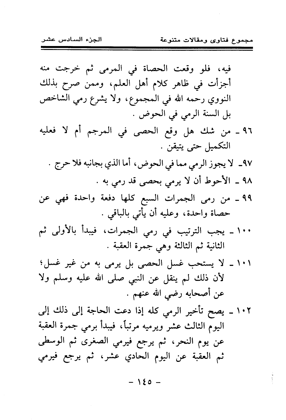 99 - من رمى الجمرات السبع كلها دفعة واحدة فهي عن حصاة واحدة، وعليه أن يأتي بالباقي.