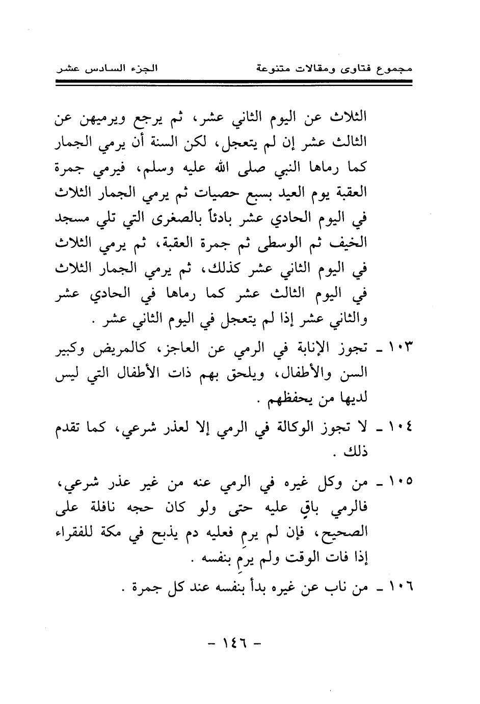104 - لا تجوز الوكالة في الرمي إلا لعذر شرعي، كما تقدم ذلك.