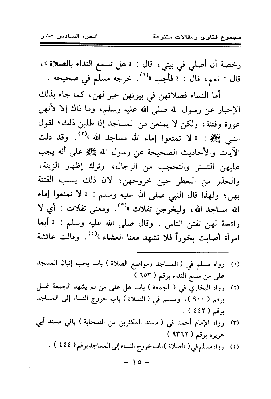 أما النساء فصلاتهن في بيوتهن خير لهن، كما جاء بذلك الإخبار عن رسول الله صلى الله عليه وسلم، وما ذاك إلا لأنهن عورة وفتنة، ولكن لا يمنعن من المساجد إذا طلبن ذلك؛ لقول النبي صلى الله عليه وسلم: «لا تمنعوا إماء الله مساجد الله (¬2) » . وقد دلت الآيات والأحاديث الصحيحة عن رسول الله صلى الله عليه وسلم على أنه يجب عليهن التستر والتحجب من الرجال، وترك إظهار الزينة، والحذر من التعطر حين خروجهن؛ لأن ذلك يسبب الفتنة بهن؛ ولهذا قال النبي صلى الله عليه وسلم: «لا تمنعوا إماء الله مساجد الله، وليخرجن تفلات (¬3) » . ومعنى تفلات: أي لا رائحة لهن تفتن الناس. وقال صلى الله عليه وسلم: «أيما امرأة أصابت بخورا فلا تشهد معنا العشاء (¬4) » . وقالت عائشة