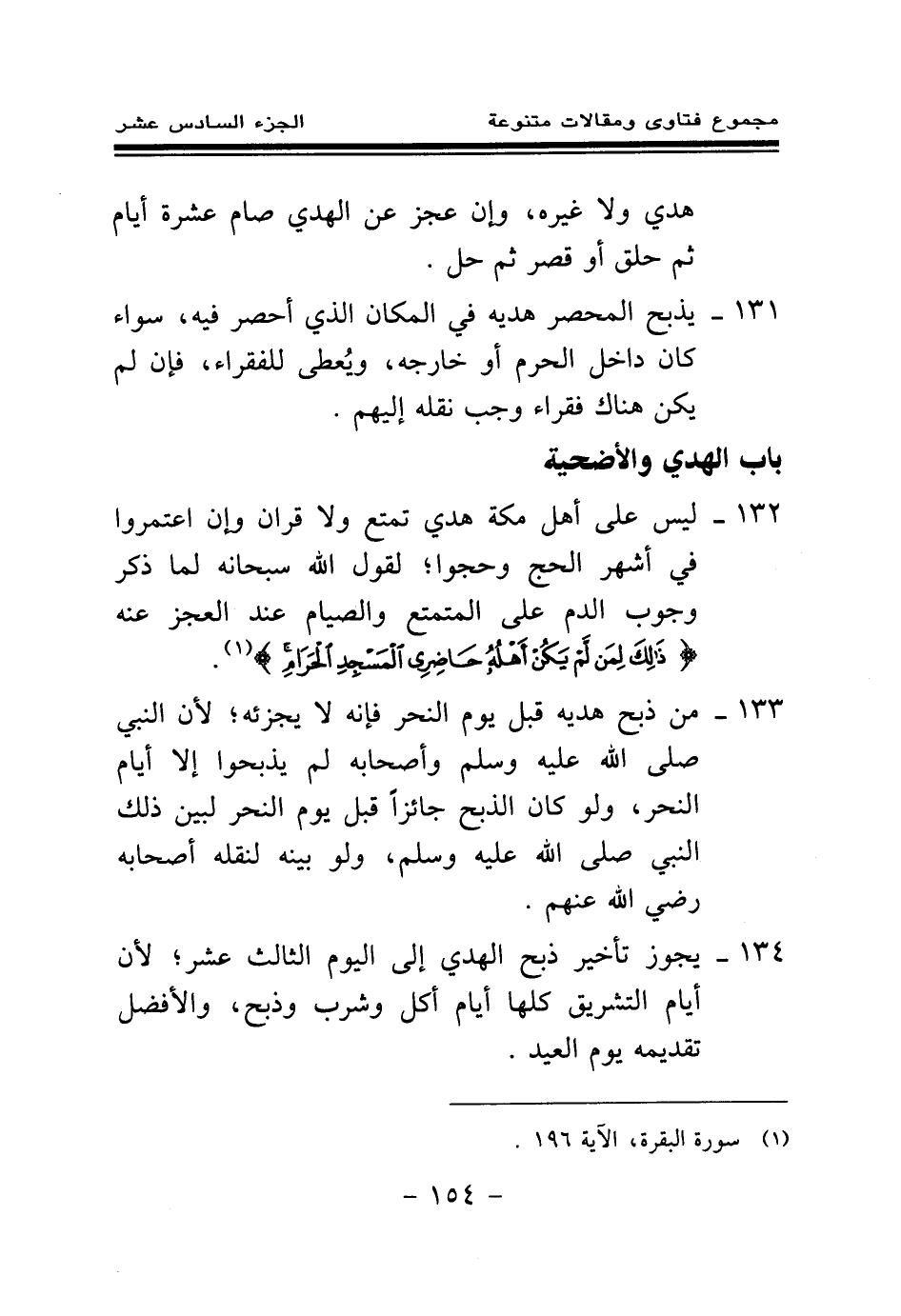 132 - ليس على أهل مكة هدي تمتع ولا قران وإن اعتمروا في أشهر الحج وحجوا؛ لقول الله سبحانه لما ذكر وجوب الدم على المتمتع والصيام عند العجز عنه {ذَلِكَ لِمَنْ لَمْ يَكُنْ أَهْلُهُ حَاضِرِي الْمَسْجِدِ الْحَرَامِ} (¬1)