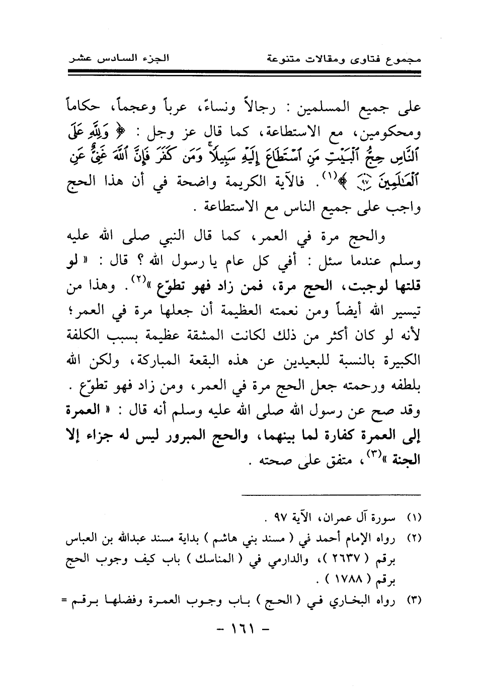 والحج مرة في العمر، كما قال النبي صلى الله عليه وسلم عندما سئل: «أفي كل عام يا رسول الله؟ قال: لو قلتها لوجبت، الحج مرة، فمن زاد فهو تطوع (¬2) » . وهذا من تيسير الله أيضا ومن نعمته العظيمة أن جعلها مرة في العمر؛ لأنه لو كان أكثر من ذلك لكانت المشقة عظيمة بسبب الكلفة الكبيرة بالنسبة للبعيدين عن هذه البقعة المباركة، ولكن الله بلطفه ورحمته جعل الحج مرة في العمر، ومن زاد فهو تطوع. وقد صح عن رسول الله صلى الله عليه وسلم أنه قال: «العمرة إلى العمرة كفارة لما بينهما، والحج المبرور ليس له جزاء إلا الجنة (¬3) » ، متفق على صحته.