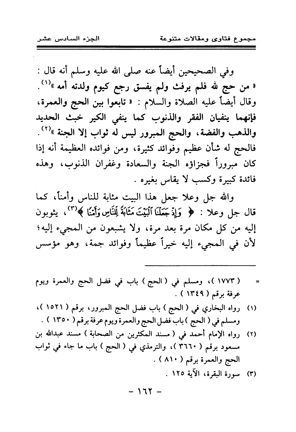 وفي الصحيحين أيضا عنه صلى الله عليه وسلم أنه قال: «من حج لله فلم يرفث ولم يفسق رجع كيوم ولدته أمه (¬1) » .