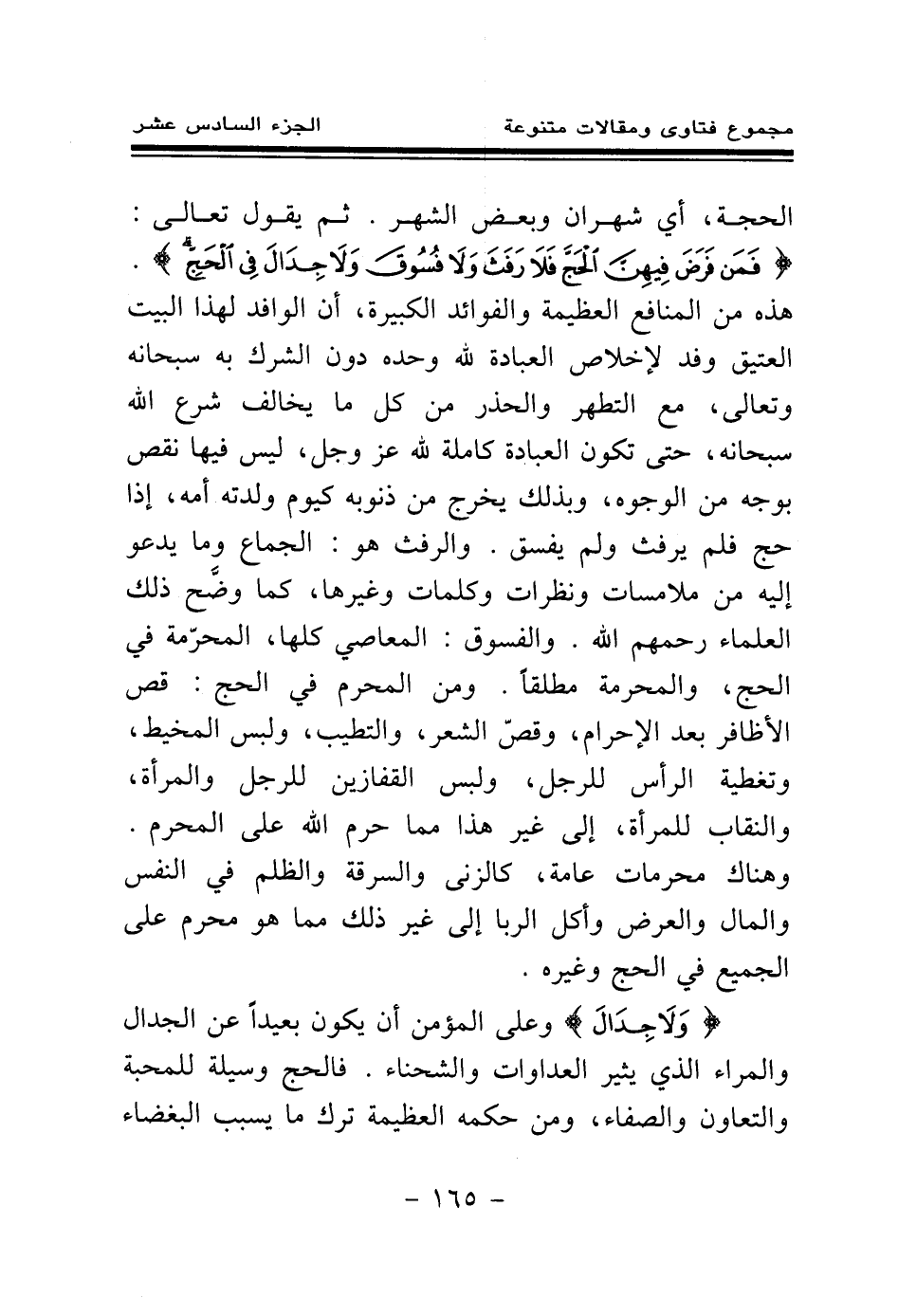 {وَلَا جِدَالَ} (¬2) وعلى المؤمن أن يكون بعيدا عن الجدال والمراء الذي يثير العداوات والشحناء فالحج وسيلة للمحبة والتعاون والصفاء، ومن حكمه العظيمة ترك ما يسبب البغضاء