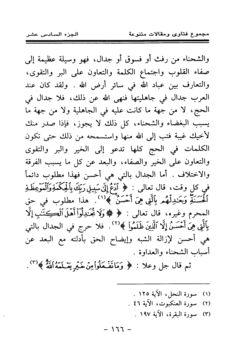 أما الجدال بالتي هي أحسن فهذا مطلوب دائما في كل وقت، قال تعالى: {ادْعُ إِلَى سَبِيلِ رَبِّكَ بِالْحِكْمَةِ وَالْمَوْعِظَةِ الْحَسَنَةِ وَجَادِلْهُمْ بِالَّتِي هِيَ أَحْسَنُ} (¬1) هذا مطلوب في حق المحرم وغيره، قال تعالى: {وَلَا تُجَادِلُوا أَهْلَ الْكِتَابِ إِلَّا بِالَّتِي هِيَ أَحْسَنُ إِلَّا الَّذِينَ ظَلَمُوا} (¬2) فلا حرج في الجدال بالتي هي أحسن لإزالة الشبه وإيضاح الحق بأدلته مع البعد عن أسباب الشحناء والعداوة.