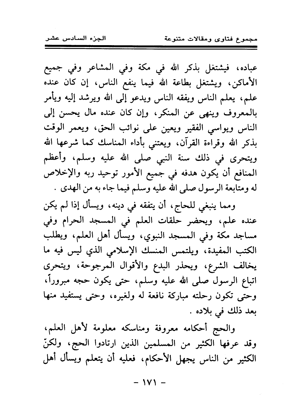 ومما ينبغي للحاج، أن يتفقه في دينه، ويسأل إذا لم يكن عنده علم، ويحضر حلقات العلم في المسجد الحرام وفي مساجد مكة وفي المسجد النبوي، ويسأل أهل العلم، ويطلب الكتب المفيدة، ويلتمس المنسك الإسلامي الذي ليس فيه ما يخالف الشرع، ويحذر البدع والأقوال المرجوحة، ويتحرى اتباع الرسول صلى الله عليه وسلم، حتى يكون حجه مبرورا، وحتى تكون رحلته مباركة نافعة له ولغيره، وحتى يستفيد منها بعد ذلك في بلاده.