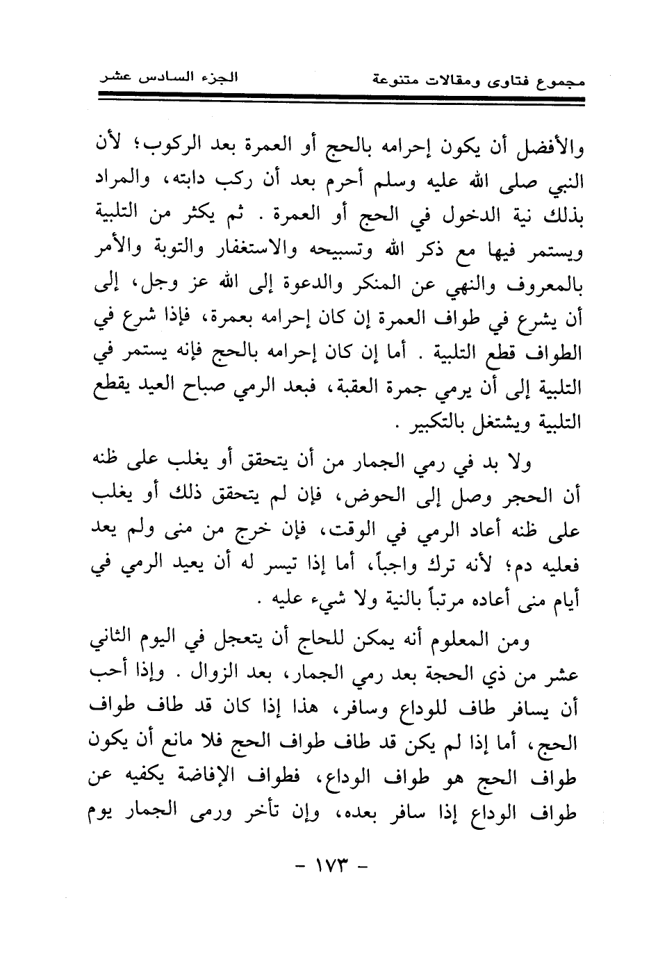 والأفضل أن يكون إحرامه بالحج أو العمرة بعد الركوب؛ لأن النبي صلى الله عليه وسلم أحرم بعد أن ركب دابته، والمراد بذلك نية الدخول في الحج أو العمرة. ثم يكثر من التلبية ويستمر فيها مع ذكر الله وتسبيحه والاستغفار والتوبة والأمر بالمعروف والنهي عن المنكر والدعوة إلى الله عز وجل، إلى أن يشرع في طواف العمرة إن كان إحرامه بعمرة، فإذا شرع في الطواف قطع التلبية. أما إن كان إحرامه بالحج فإنه يستمر في التلبية إلى أن يرمي جمرة العقبة، فبعد الرمي صباح العيد يقطع التلبية ويشتغل بالتكبير.
