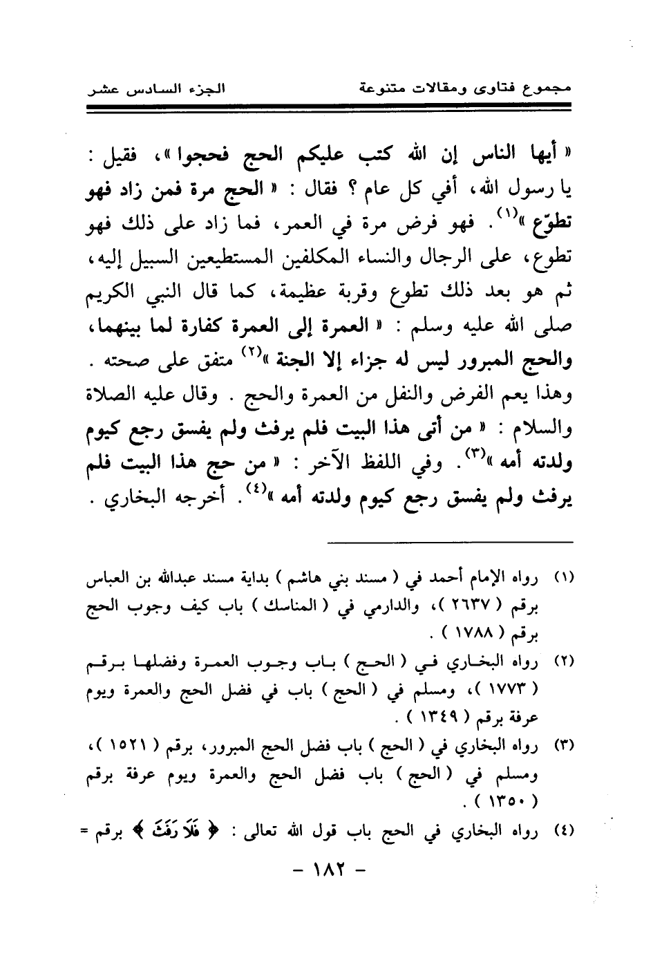 «أيها الناس إن الله كتب عليكم الحج فحجوا، فقيل: يا رسول الله، أفي كل عام؟ فقال: الحج مرة فمن زاد فهو تطوع (¬1) » . فهو فرض مرة في العمر، فما زاد على ذلك فهو تطوع، على الرجال والنساء المكلفين المستطيعين السبيل إليه، ثم هو بعد ذلك تطوع وقربة عظيمة، كما قال النبي الكريم صلى الله عليه وسلم: «العمرة إلى العمرة كفارة لما بينهما، والحج المبرور ليس له جزاء إلا الجنة (¬2) » متفق على صحته. وهذا يعم الفرض والنفل من العمرة والحج. وقال عليه الصلاة والسلام: «من أتى هذا البيت فلم يرفث ولم يفسق رجع كيوم ولدته أمه (¬3) » . وفي اللفظ الآخر: «من حج هذا البيت فلم يرفث ولم يفسق رجع كيوم ولدته أمه (¬4) » . أخرجه البخاري.