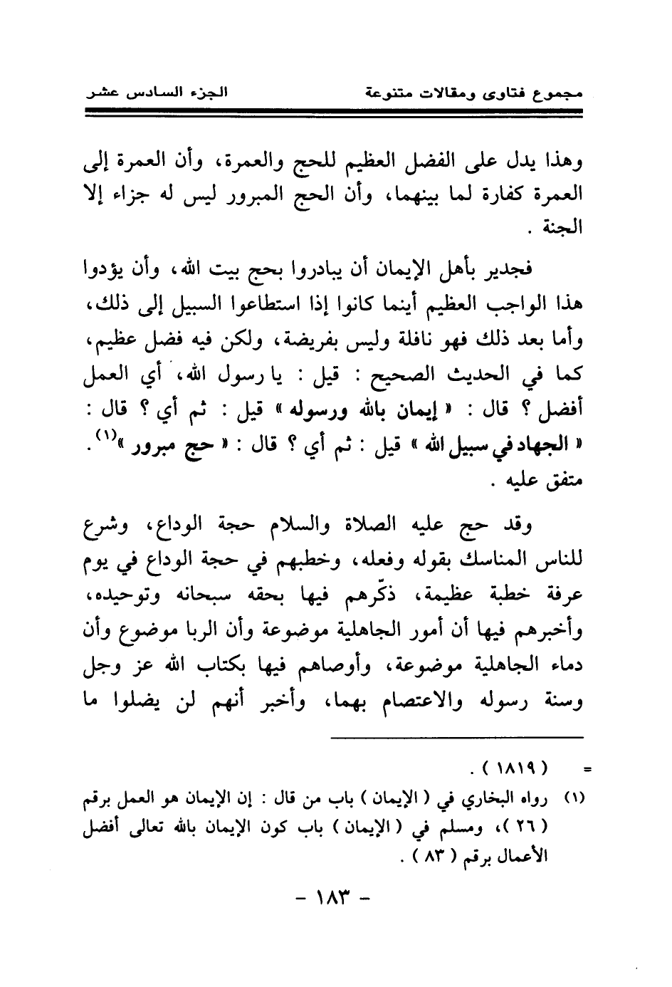 (¬1) رواه البخاري في (الإيمان) باب من قال: إن الإيمان هو العمل برقم (26) ومسلم في (الإيمان) باب كون الإيمان بالله تعالى أفضل الأعمال برقم (83) .