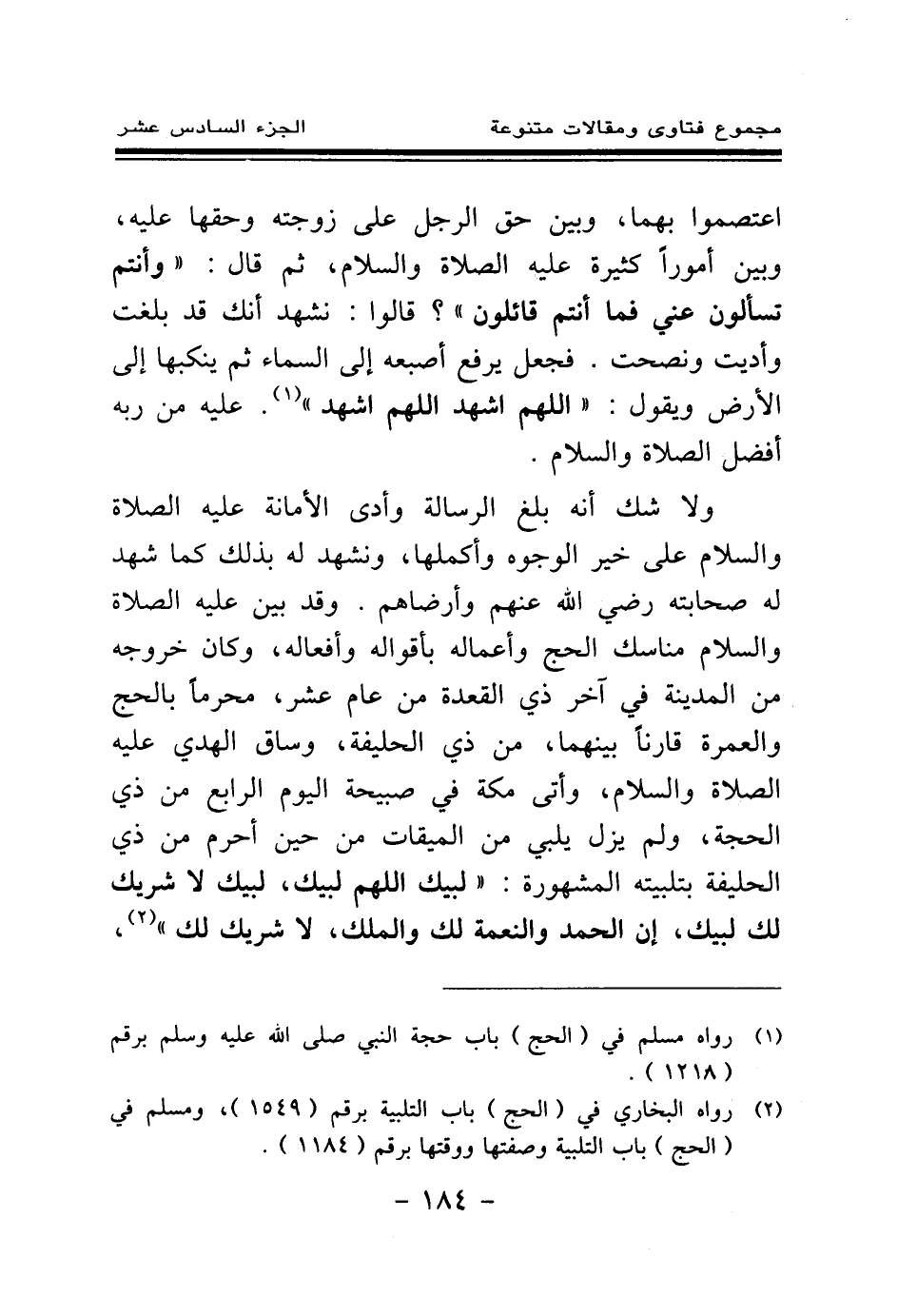 اعتصموا بهما، وبين حق الرجل على زوجته وحقها عليه، وبين أمورا كثيرة عليه الصلاة والسلام، ثم قال: «وأنتم تسألون عني فما أنتم قائلون؟ قالوا: نشهد أنك قد بلغت وأديت ونصحت. فجعل يرفع أصبعه إلى السماء ثم ينكبها إلى الأرض ويقول: اللهم اشهد اللهم اشهد (¬1) » . عليه من ربه أفضل الصلاة والسلام.