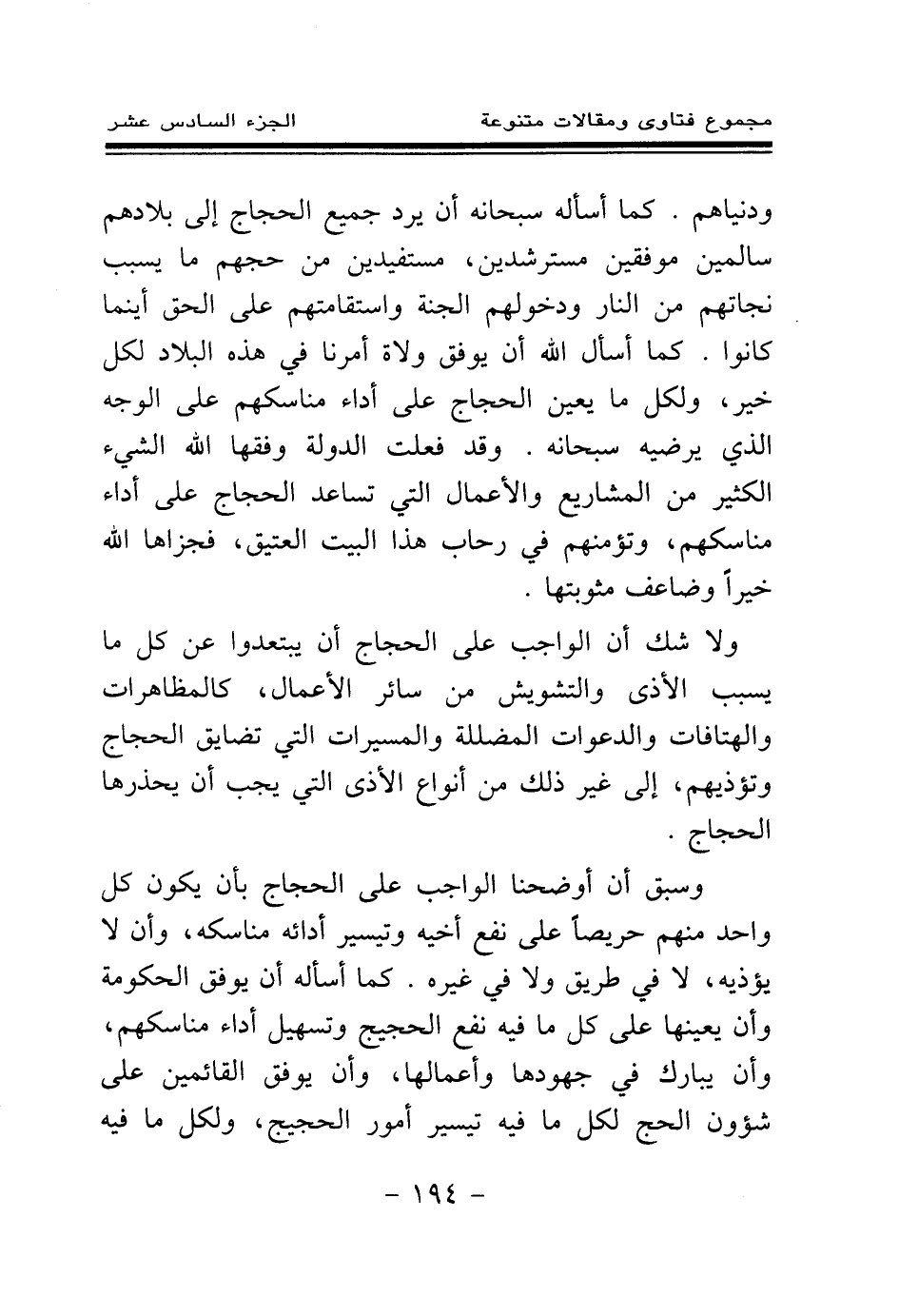 وسبق أن أوضحنا الواجب على الحجاج بأن يكون كل واحد منهم حريصا على نفع أخيه وتيسير أدائه مناسكه، وأن لا يؤذيه، لا في طريق ولا في غيره. كما أسأله أن يوفق الحكومة وأن يعينها على كل ما فيه نفع الحجيج وتسهيل أداء مناسكهم، وأن يبارك في جهودها وأعمالها، وأن يوفق القائمين على شئون الحج لكل ما فيه تيسير أمور الحجيج، ولكل ما فيه