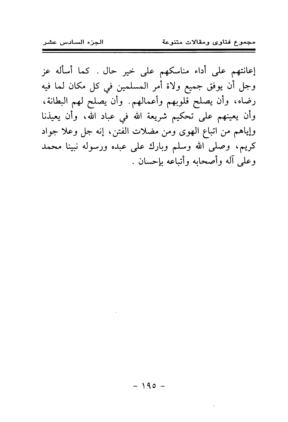 إعانتهم على أداء مناسكهم على خير حال. كما أسأله عز وجل أن يوفق جميع ولاة أمر المسلمين في كل مكان لما فيه رضاه، وأن يصلح قلوبهم وأعمالهم. وأن يصلح لهم البطانة، وأن يعينهم على تحكيم شريعة الله في عباد الله، وأن يعيذنا وإياهم من اتباع الهوى ومن مضلات الفتن، إنه جل وعلا جواد كريم، وصلى الله وسلم وبارك على عبده ورسوله نبينا محمد وعلى آله وأصحابه وأتباعه بإحسان.