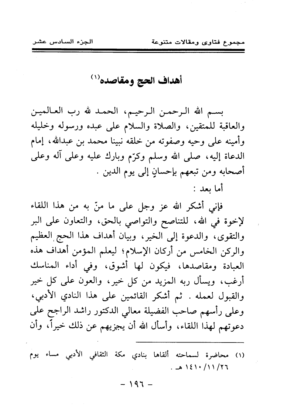 (¬1) محاضرة لسماحته ألقاها بنادي مكة الثقافي الأدبي مساء يوم 26\11\1410هـ.