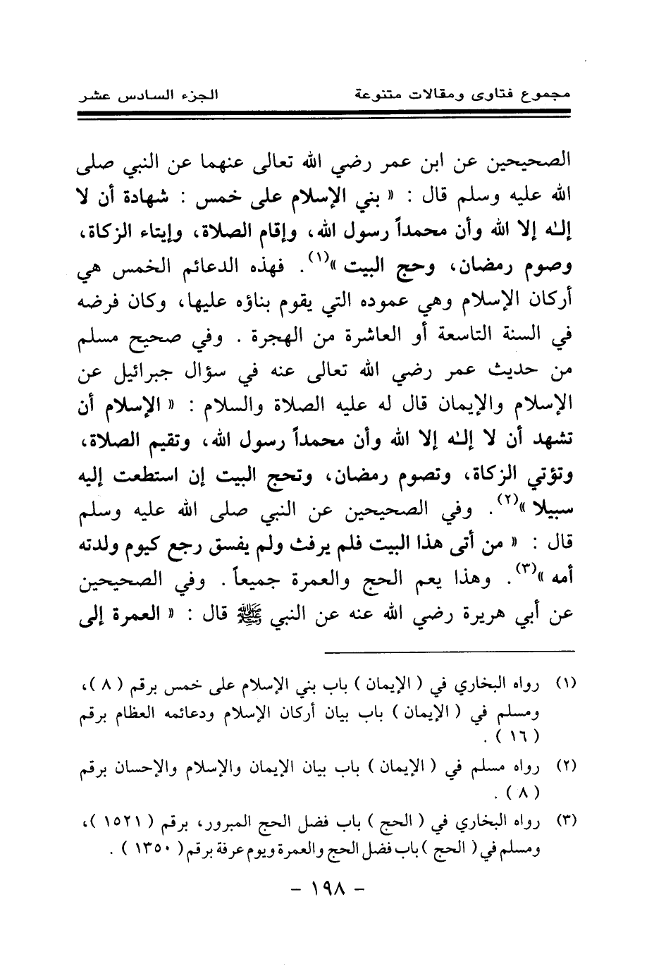 الصحيحين عن ابن عمر رضي الله تعالى عنهما عن النبي صلى الله عليه وسلم قال: «بني الإسلام على خمس: شهادة أن لا إله إلا الله وأن محمدا رسول الله، وإقام الصلاة، وإيتاء الزكاة، وصوم رمضان، وحج البيت (¬1) » . فهذه الدعائم الخمس هي أركان الإسلام وهي عموده التي يقوم بناؤه عليها، وكان فرضه في السنة التاسعة أو العاشرة من الهجرة. وفي صحيح مسلم من حديث عمر رضي الله تعالى عنه في سؤال جبرائيل عن الإسلام والإيمان قال له عليه الصلاة والسلام: «الإسلام أن تشهد أن لا إله إلا الله وأن محمدا رسول الله، وتقيم الصلاة، وتؤتي الزكاة، وتصوم رمضان، وتحج البيت إن استطعت إليه سبيلا (¬2) » . وفي الصحيحين عن النبي صلى الله عليه وسلم قال: «من أتى هذا البيت فلم يرفث ولم يفسق رجع كيوم ولدته أمه (¬3) » . وهذا يعم الحج والعمرة جميعا. وفي الصحيحين عن أبي هريرة رضي الله عنه عن النبي صلى الله عليه وسلم قال: «العمرة إلى