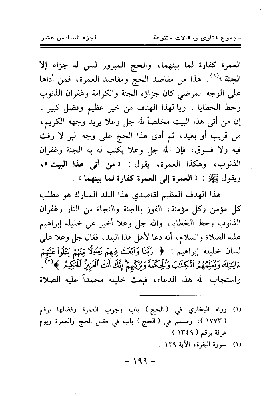 إن من أتى هذا البيت مخلصا لله جل وعلا يريد وجهه الكريم، من قريب أو بعيد، ثم أدى هذا الحج على وجه البر لا رفث فيه ولا فسوق، فإن الله جل وعلا يكتب له به الجنة وغفران الذنوب، وهكذا العمرة، يقول: «من أتى هذا البيت (¬2) » ، ويقول صلى الله عليه وسلم: «العمرة إلى العمرة كفارة لما بينهما (¬3) » .