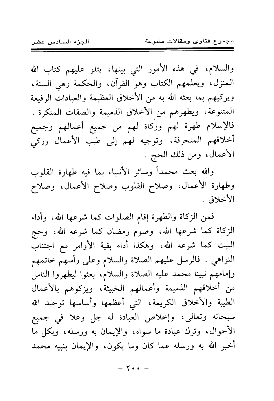 والسلام، في هذه الأمور التي بينها، ويتلو عليهم كتاب الله المنزل، ويعلمهم الكتاب وهو القرآن، والحكمة وهي السنة، ويزكيهم بما بعثه الله به من الأخلاق العظيمة والعبادات الرفيعة المتنوعة، ويطهرهم من الأخلاق الذميمة والصفات المنكرة. فالإسلام طهرة لهم وزكاة لهم من جميع أعمالهم وجميع أخلاقهم المنحرفة، وتوجيه لهم إلى طيب الأعمال وزكي الأعمال، ومن ذلك الحج.