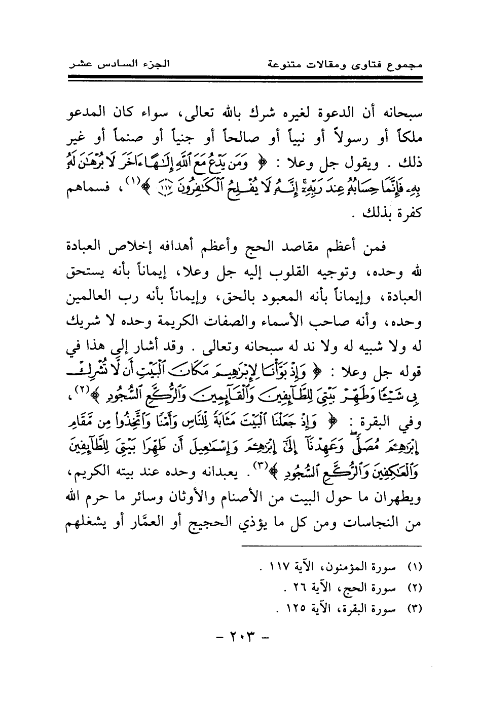 فمن أعظم مقاصد الحج وأعظم أهدافه إخلاص العبادة لله وحده، وتوجيه القلوب إليه جل وعلا، إيمانا بأنه يستحق العبادة، وإيمانا بأنه المعبود الحق، وإيمانا بأنه رب العالمين وحده، وأنه صاحب الأسماء والصفات الكريمة وحده لا شريك له ولا شبيه له ولا ند له سبحانه وتعالى. وقد أشار إلى هذا في قوله جل وعلا: {وَإِذْ بَوَّأْنَا لِإِبْرَاهِيمَ مَكَانَ الْبَيْتِ أَنْ لَا تُشْرِكْ بِي شَيْئًا وَطَهِّرْ بَيْتِيَ لِلطَّائِفِينَ وَالْقَائِمِينَ وَالرُّكَّعِ السُّجُودِ} (¬2) وفي البقرة: {وَإِذْ جَعَلْنَا الْبَيْتَ مَثَابَةً لِلنَّاسِ وَأَمْنًا وَاتَّخِذُوا مِنْ مَقَامِ إِبْرَاهِيمَ مُصَلًّى وَعَهِدْنَا إِلَى إِبْرَاهِيمَ وَإِسْمَاعِيلَ أَنْ طَهِّرَا بَيْتِيَ لِلطَّائِفِينَ وَالْعَاكِفِينَ وَالرُّكَّعِ السُّجُودِ} (¬3) يعبدانه وحده عند بيته الكريم، ويطهران ما حول البيت من الأصنام والأوثان وسائر ما حرم الله من النجاسات ومن كل ما يؤذي الحجيج أو العمار أو يشغلهم