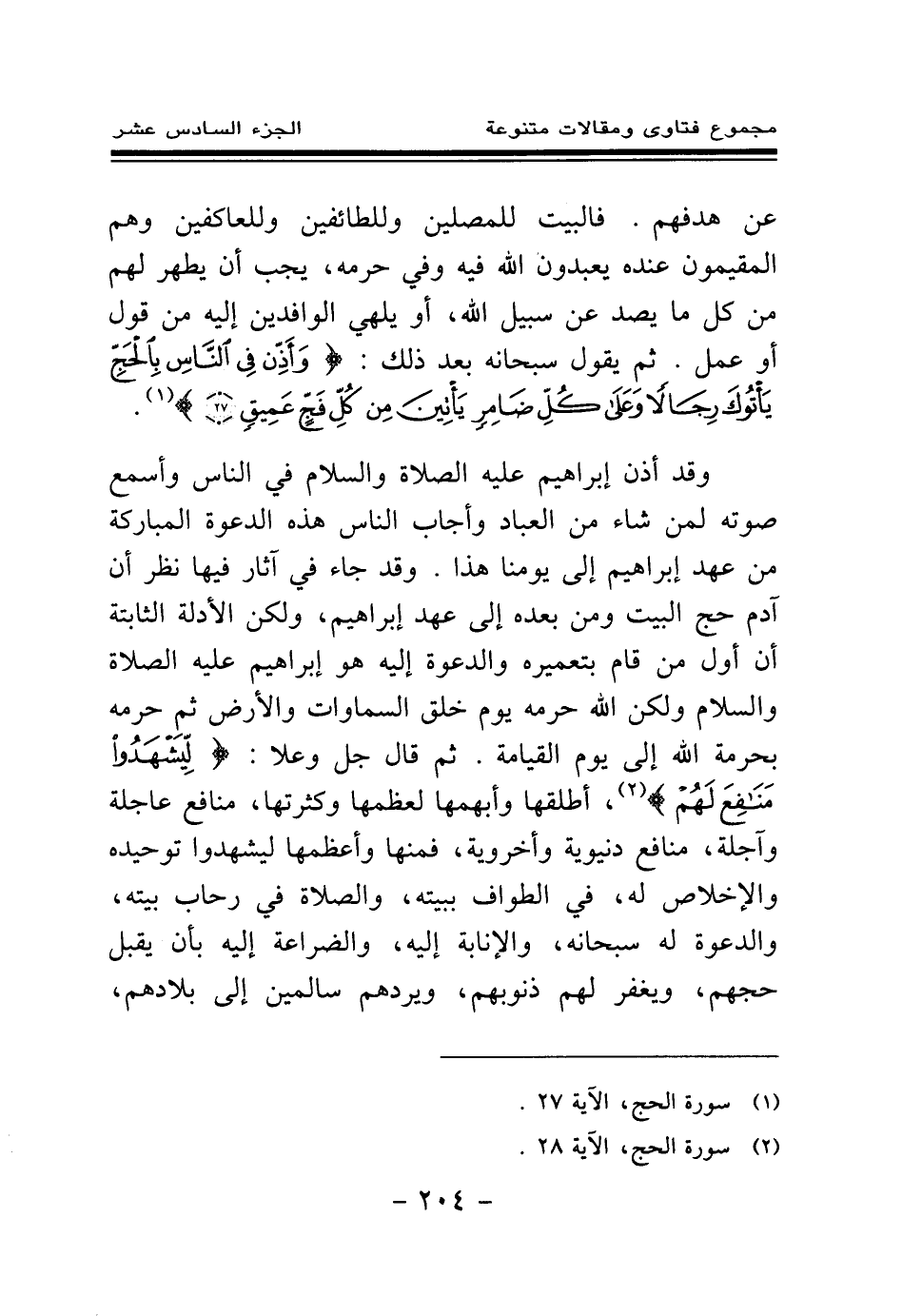 عن هدفهم. فالبيت للمصلين وللطائفين وللعاكفين وهم المقيمون عنده يعبدون الله فيه وفي حرمه، يجب أن يطهر لهم من كل ما يصد عن سبيل الله، أو يلهي الوافدين إليه من قول أو عمل. ثم يقول سبحانه بعد ذلك: {وَأَذِّنْ فِي النَّاسِ بِالْحَجِّ يَأْتُوكَ رِجَالًا وَعَلَى كُلِّ ضَامِرٍ يَأْتِينَ مِنْ كُلِّ فَجٍّ عَمِيقٍ} (¬1)