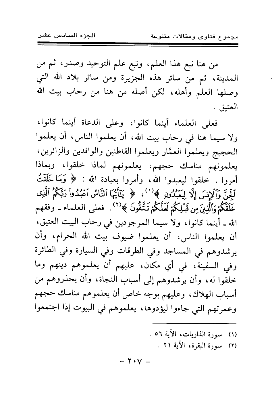 فعلى العلماء أينما كانوا، وعلى الدعاة أينما كانوا، ولا سيما هنا في رحاب بيت الله، أن يعلموا الناس، أن يعلموا الحجيج ويعلموا العمار ويعلموا القاطنين والوافدين والزائرين، يعلمونهم مناسك حجهم، يعلمونهم لماذا خلقوا، وبماذا أمروا. خلقوا ليعبدوا الله، وأمروا بعبادة الله: {وَمَا خَلَقْتُ الْجِنَّ وَالْإِنْسَ إِلَّا لِيَعْبُدُونِ} (¬1) {يَا أَيُّهَا النَّاسُ اعْبُدُوا رَبَّكُمُ الَّذِي خَلَقَكُمْ وَالَّذِينَ مِنْ قَبْلِكُمْ لَعَلَّكُمْ تَتَّقُونَ} (¬2) فعلى العلماء - وفقهم الله - أينما كانوا، ولا سيما الموجودين في رحاب البيت العتيق، أن يعلموا الناس، أن يعلموا ضيوف بيت الله الحرام، وأن يرشدوهم في المساجد وفي الطرقات وفي السيارة وفي الطائرة وفي السفينة، في أي مكان، عليهم أن يعلموهم دينهم وما خلقوا له، وأن يرشدوهم إلى أسباب النجاة، وأن يحذروهم من أسباب الهلاك، وعليهم بوجه خاص أن يعلموهم مناسك حجهم وعمرتهم التي جاءوا ليؤدوها، يعلموهم في البيوت إذا اجتمعوا