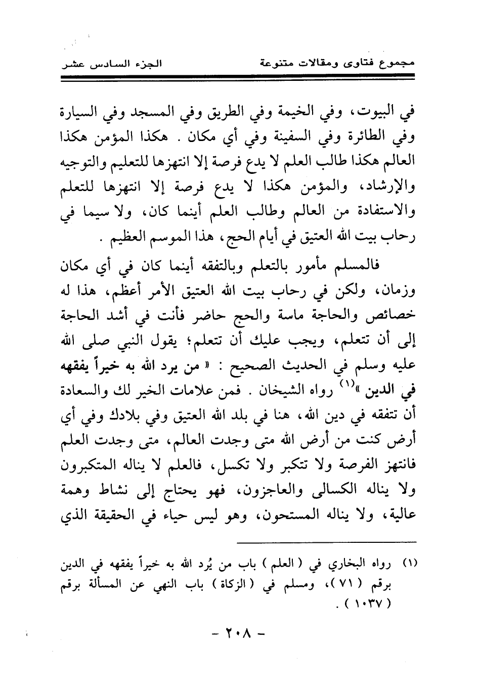 فالمسلم مأمور بالتعلم وبالتفقه أينما كان في أي مكان وزمان، ولكن في رحاب بيت الله العتيق الأمر أعظم، هذا له خصائص والحاجة ماسة والحج حاضر فأنت في أشد الحاجة إلى أن تتعلم، ويجب عليك أن تتعلم؛ يقول النبي صلى الله عليه وسلم في الحديث الصحيح: «من يرد الله به خيرا يفقهه في الدين (¬1) » رواه الشيخان. فمن علامات الخير لك والسعادة أن تتفقه في دين الله، هنا في بلد الله العتيق وفي بلادك وفي أي أرض كنت من أرض الله متى وجدت العالم، متى وجدت العلم فانتهز الفرصة ولا تتكبر ولا تكسل، فالعلم لا يناله المتكبرون ولا يناله الكسالى والعاجزون، فهو يحتاج إلى نشاط وهمة عالية، ولا يناله المستحون، وهو ليس حياء في الحقيقة الذي