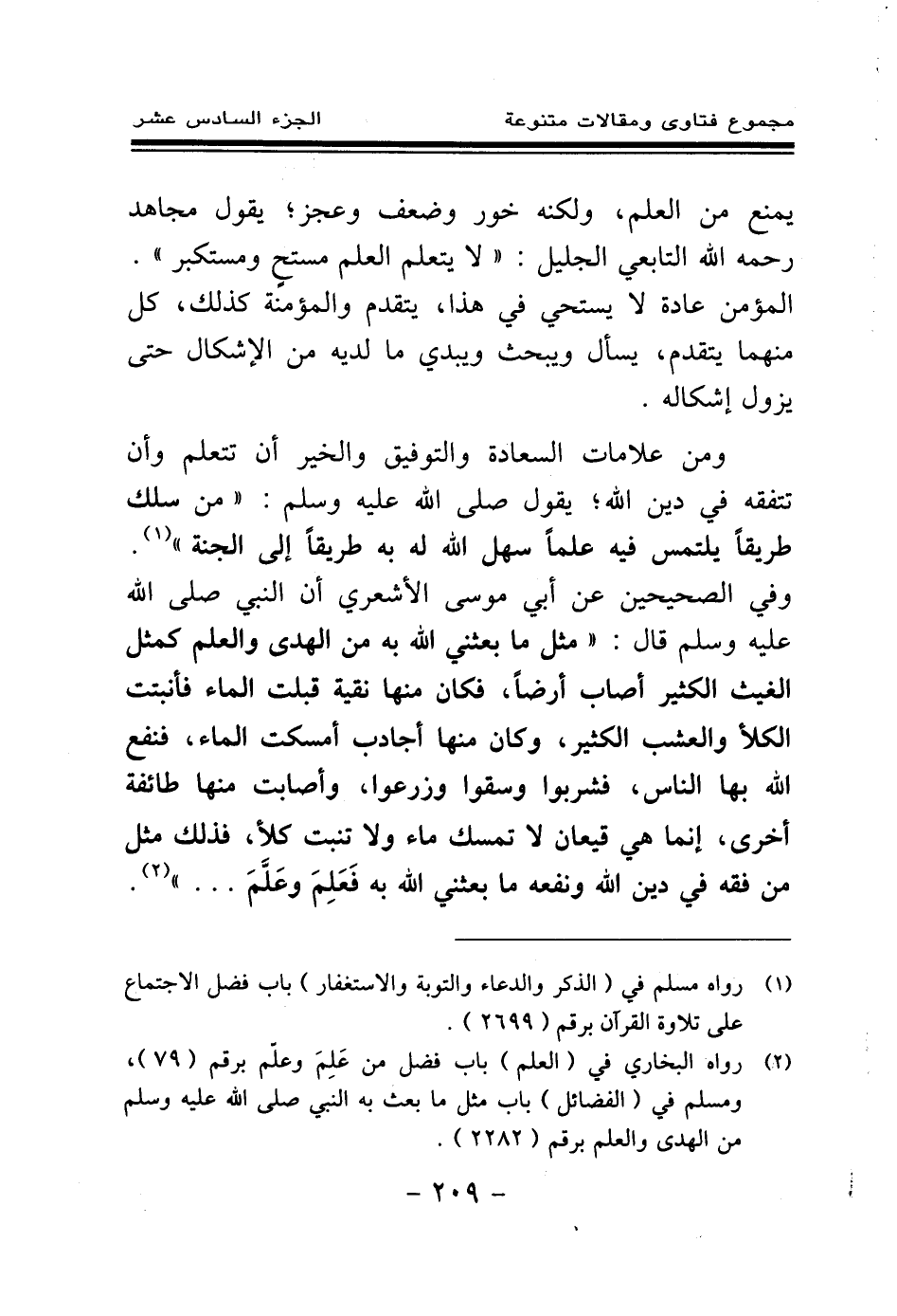 (¬2) رواه البخاري في (العلم) باب فضل من علم وعلم برقم (79) ، ومسلم في (الفضائل) باب مثل ما بعث به النبي صلى الله عليه وسلم من الهدى والعلم برقم (2282) .