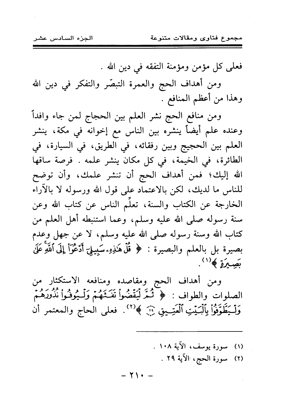 ومن منافع الحج نشر العلم بين الحجاج لمن جاء وافدا وعنده علم أيضا ينشره بين الناس مع إخوانه في مكة، ينشر العلم بين الحجيج وبين رفقائه، في الطريق، في السيارة، في الطائرة، في الخيمة، في كل مكان ينشر علمه. فرصة ساقها الله إليك؛ فمن أهداف الحج أن تنشر علمك، وأن توضح للناس ما لديك، لكن بالاعتماد على قول الله ورسوله لا بالآراء الخارجة عن الكتاب والسنة، تعلم الناس عن كتاب الله وعن سنة رسوله صلى الله عليه وسلم، وعما استنبطه أهل العلم من كتاب الله وسنة رسوله صلى الله عليه وسلم، لا عن جهل وعدم بصيرة بل بالعلم والبصيرة: {قُلْ هَذِهِ سَبِيلِي أَدْعُو إِلَى اللَّهِ عَلَى بَصِيرَةٍ} (¬1)