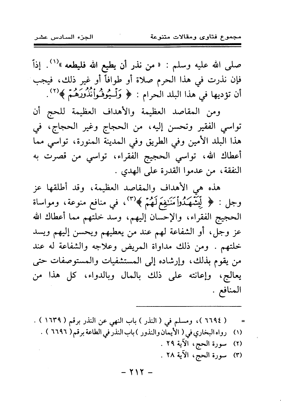 هذه هي الأهداف والمقاصد العظيمة، وقد أطلقها عز وجل: {لِيَشْهَدُوا مَنَافِعَ لَهُمْ} (¬3) في منافع منوعة، ومواساة الحجيج الفقراء، والإحسان إليهم، وسد خلتهم مما أعطاك الله عز وجل، أو الشفاعة لهم عند من يعطيهم ويحسن إليهم ويسد خلتهم. ومن ذلك مداواة المريض وعلاجه والشفاعة له عند من يقوم بذلك، وإرشاده إلى المستشفيات والمستوصفات حتى يعالج، وإعانته على ذلك بالمال وبالدواء، كل هذا من المنافع.